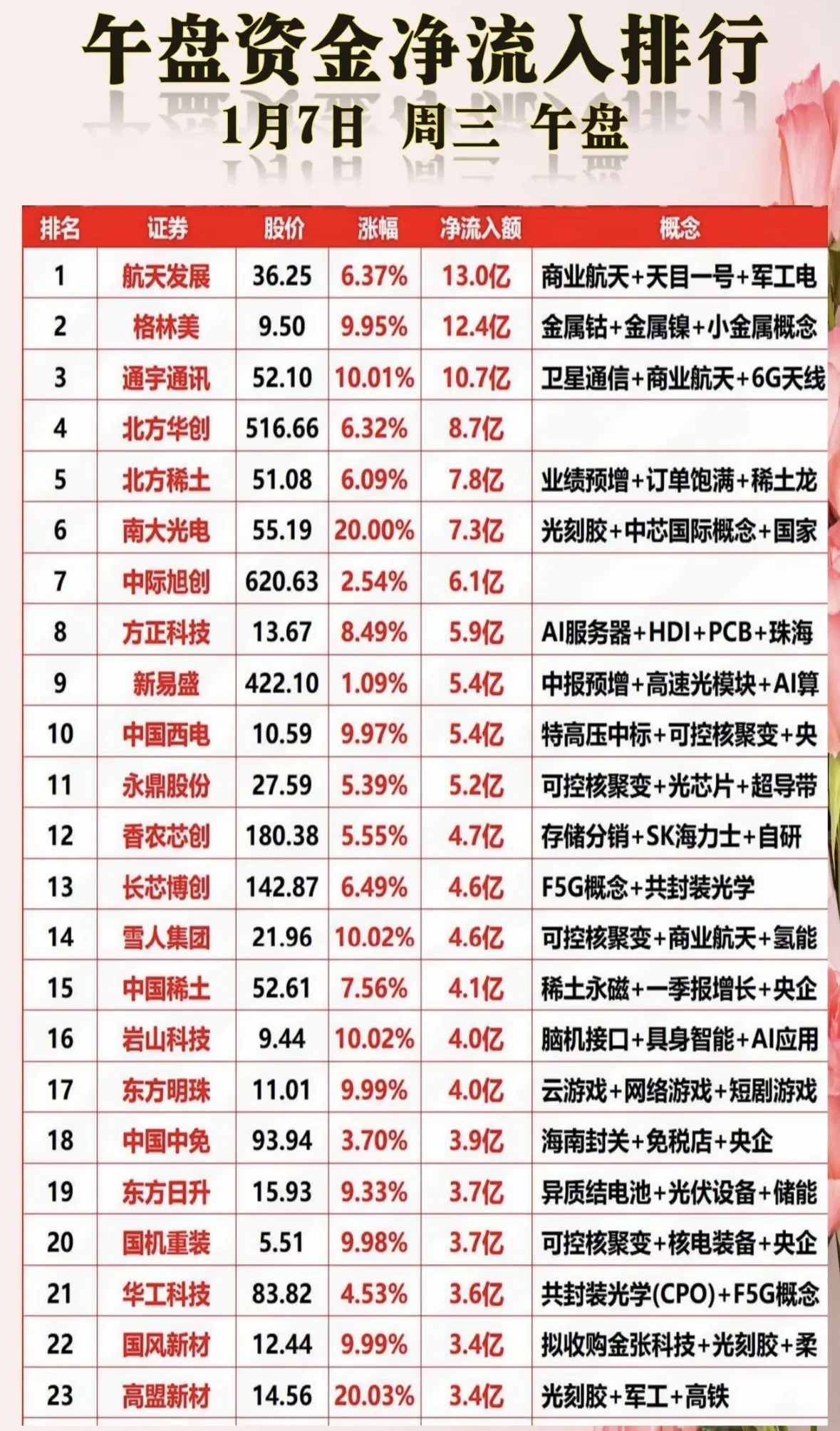 今日中午资金净流入个股梳理航天军工领涨,光刻胶稀土活跃,商业卫星与可控核聚变成热