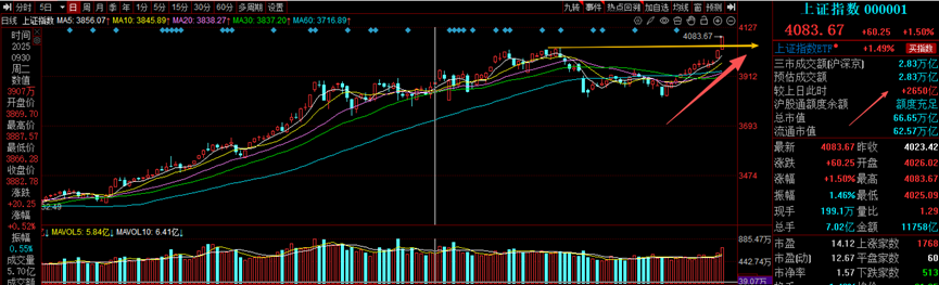 沪指强势走出13连阳,创下逾十年新高,整体呈现加速上升态势。周二放量突破重要阻力位,量能充足,量价关系匹配,走势健康稳健。市场情绪高涨,上涨个股数量多,行业板块几乎全线上扬,突破后套牢盘压力降低,上升趋势明确,对于周三的走势,个人还是比较乐观的。