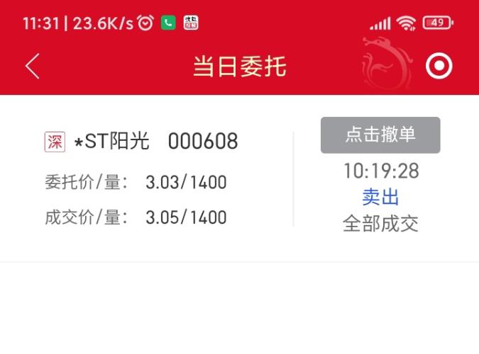 阳光今天3.05翻倍,资金也6位进7,本是高兴的事。在毫无意愿的情况下被莫名其妙自动卖出半仓1400股(总2900),饱受打击。疑点10:04打开板瞬间又封板,3.05封板状态下10:19:28委托价3.03。开板至委托这14分钟时间没看盘,行情交易软件都打开在线。10:48左右看持仓发现问题手机上成交明细10:04开板状态只成交3笔,开板后1笔3.04,后两笔外盘成交3.05,然后封板。每笔3秒,费时9-12秒。(注:非东方财富软件)。 //@短空长多常待 :持仓。