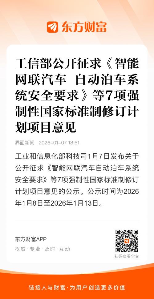 工业和信息化部科技司1月7日发布关于公开征求《智能网联汽车自动泊车系统安全要求》等7项强制性国家标准制修订计划项目意见的公示。公示时间为2026年1月8日至2026年1月13日。