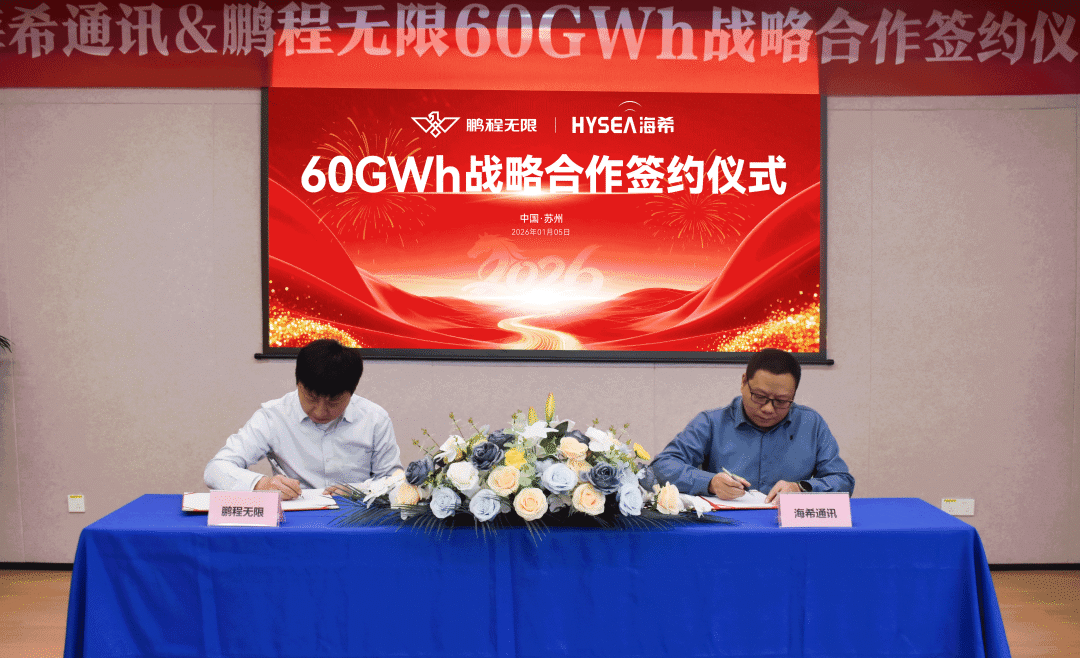 此外,1月5日,海希通讯与鹏程无限正式签署一项规模达60GWh的战略合作协议。双方宣布,将整合产业资源与核心优势,共同提升产业链协同效率,旨在打造具备市场竞争力的储能系统产品。