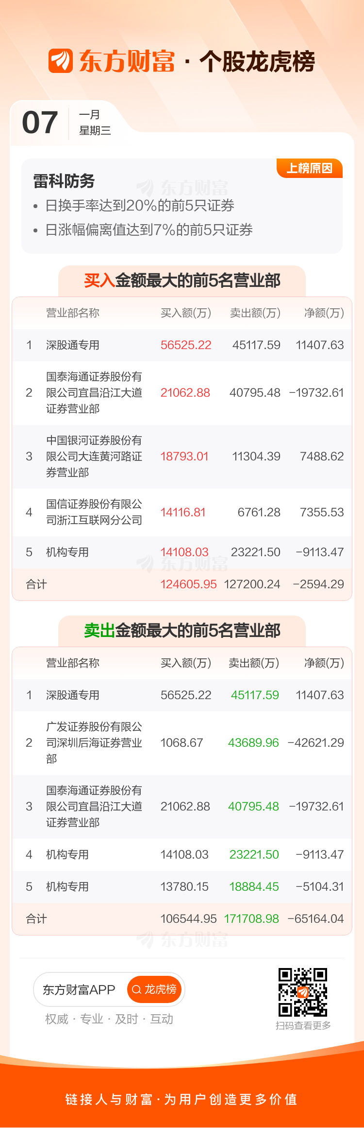 交易所2026年1月7日公布的交易公开信息显示,雷科防务因成为日换手率达到20%的前5只证券、日涨幅偏离值达到7%的前5只证券上榜。雷科防务当日收报16.71元,涨跌幅10.01%,偏离值65.12%,换手率65.12%,成交额132.30亿。