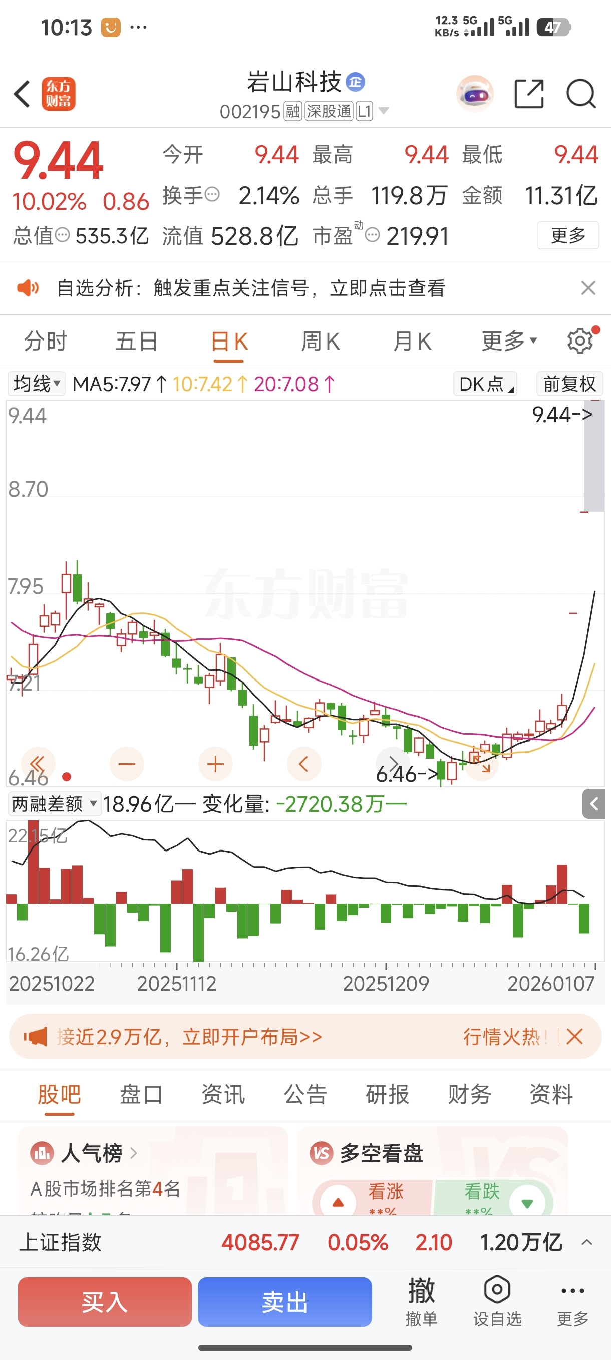 明天岩山科技依旧是顶板高开,然后随大盘向下波动打开板,将苦大仇深套了接近半年的散户筹码,和少量获利盘震出来。庄家控盘调整几天后,再自拉自唱,稳步推高。预计明天#收盘点评# #炒股日记# #实盘记录# #投资随笔# 收盘十元左右。@岩山科技