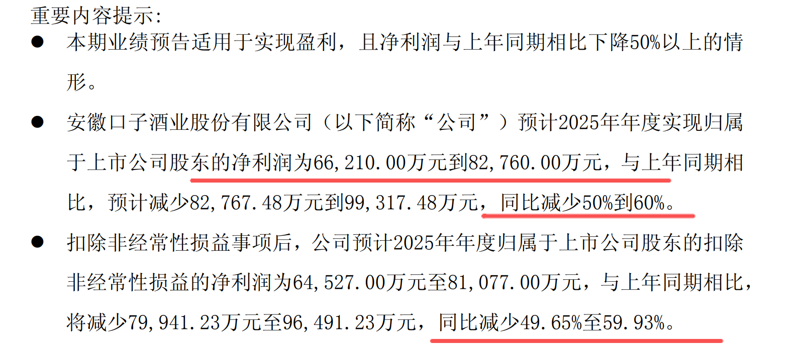口子窖,利润下滑50%到60%,利润回落到6.6亿到8.3亿;