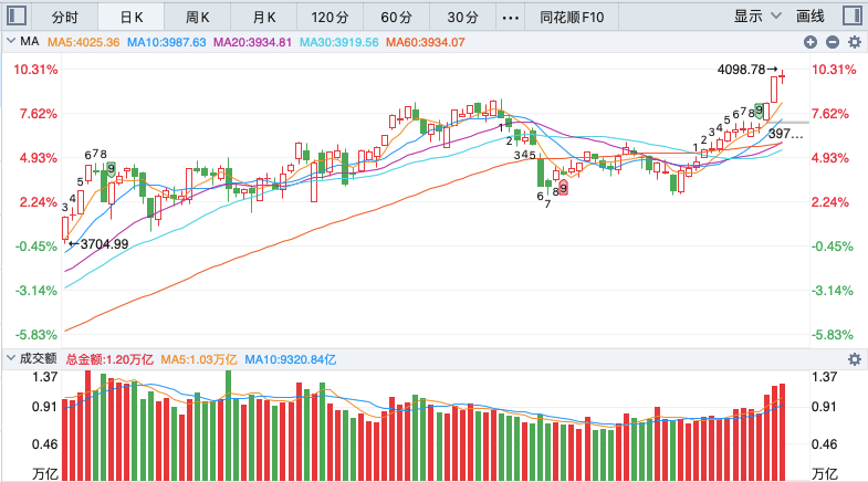 三大股指在昨天勉强收红,上证指数更是收出14连阳走势,但没有了前两个交易日里的大涨,上演持续狂飙行情。因为两个交易日就将股指推升到4100点附近,这个走势带来的成交量同步放大,在经过了公募基金等集体回补,目前也开始进入情绪退潮阶段,特别是昨天尾盘阶段集合竞价中信证券的大额卖一压单。反馈现在整体需要适当降温,而从权重的表现集体冲高回落,银行出现了大幅调整也在这个范畴内。其次则是目前的市场当中题材也开始逐步退潮,所以春季的行情第一阶段应该告一段落,将会再度进入横盘震荡整理的时间周期。