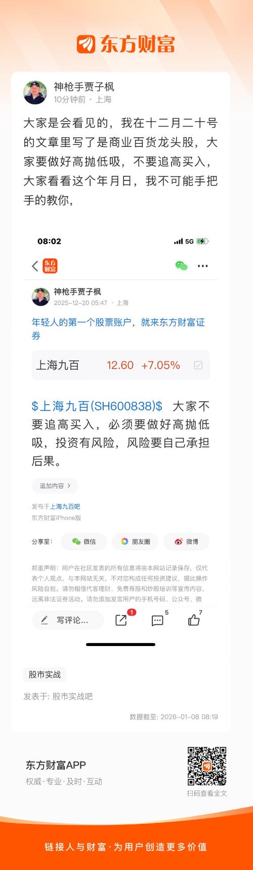 大家是会看见的,我在十二月二十号的文章里写了是商业百货龙头股,大家要做好高抛低吸,不要追高买入,大家看看这个年月日,我不可能手把手的教你,