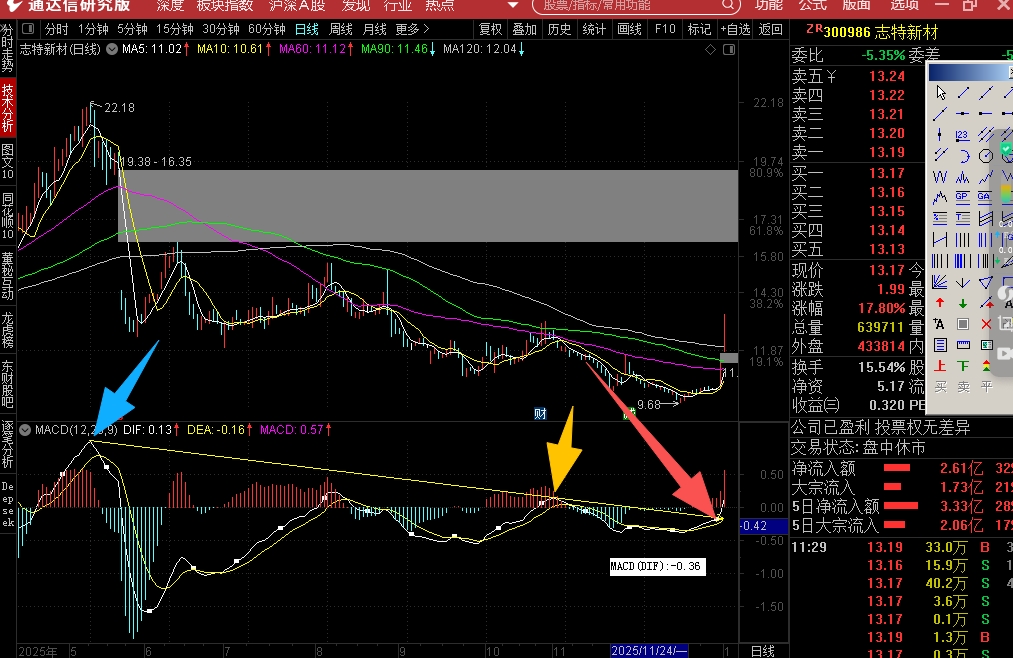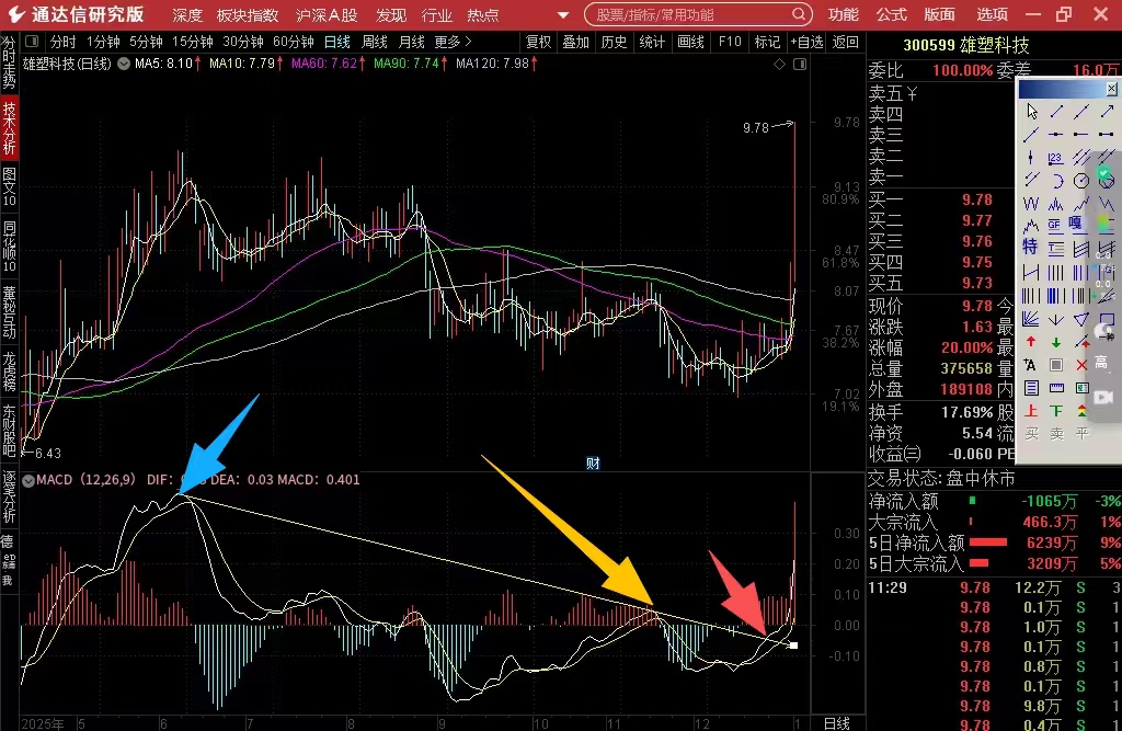 在通达信上,打开一支股票, 在所显示的界面中(不需要缩图),双击MACD副图放大。我们的方法是通过MACD在快线上(DIF,白色线)画切线来实现的。