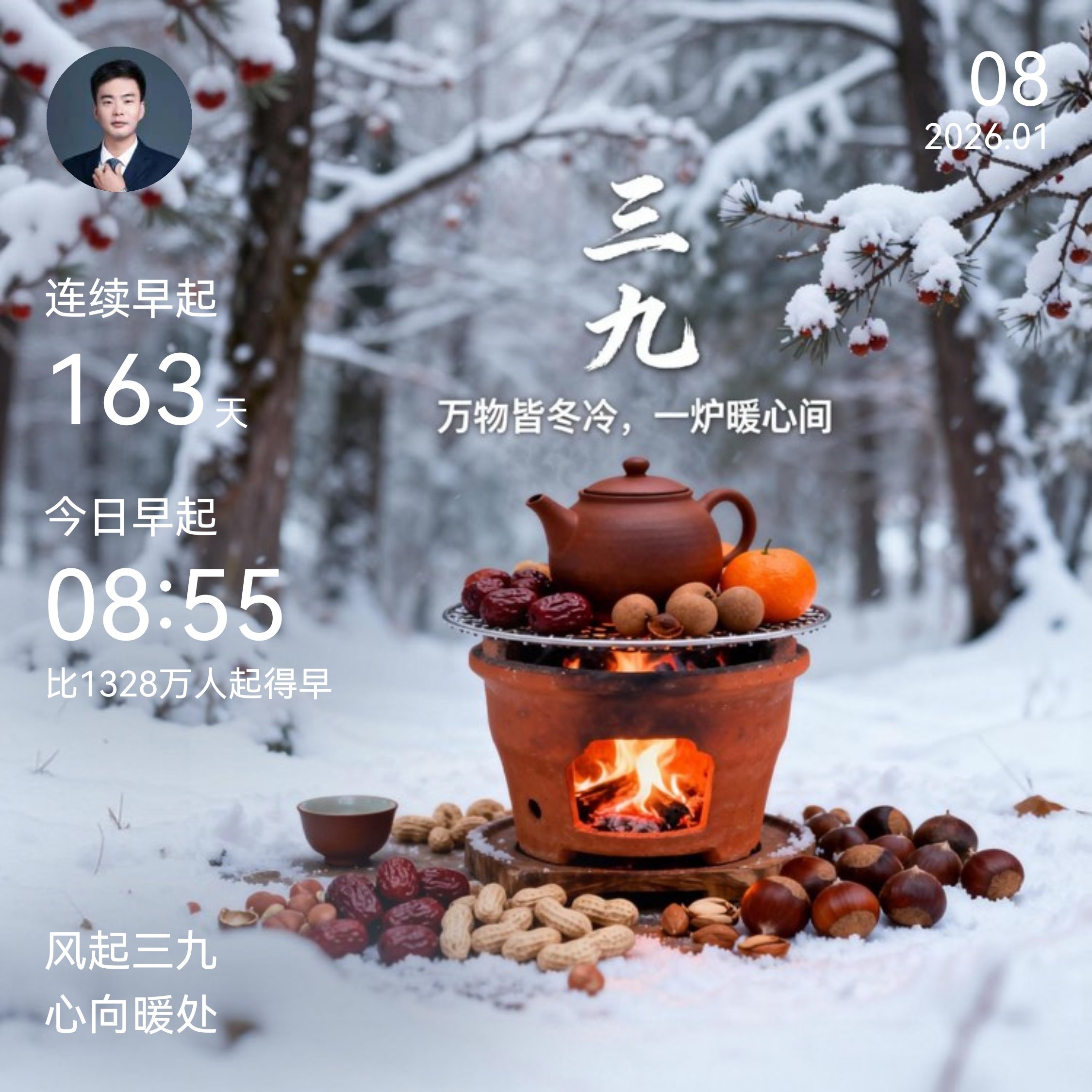 今天是2026年1月8日星期四,农历十一月二十,三九,朋友们大家早上好!风起三九