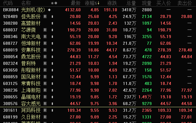 盘面上,光刻机、工业气体、存储芯片、可控核聚变、先进封装、水产品等题材涨幅靠前。光刻机概念掀起涨停潮,高盟新材、华融化学、南大光电、恒坤新材、安达智能等触及“20cm”涨停板,普利特、彤程新材、长青科技、中瓷电子、国风新材等收获“10cm”涨停板。