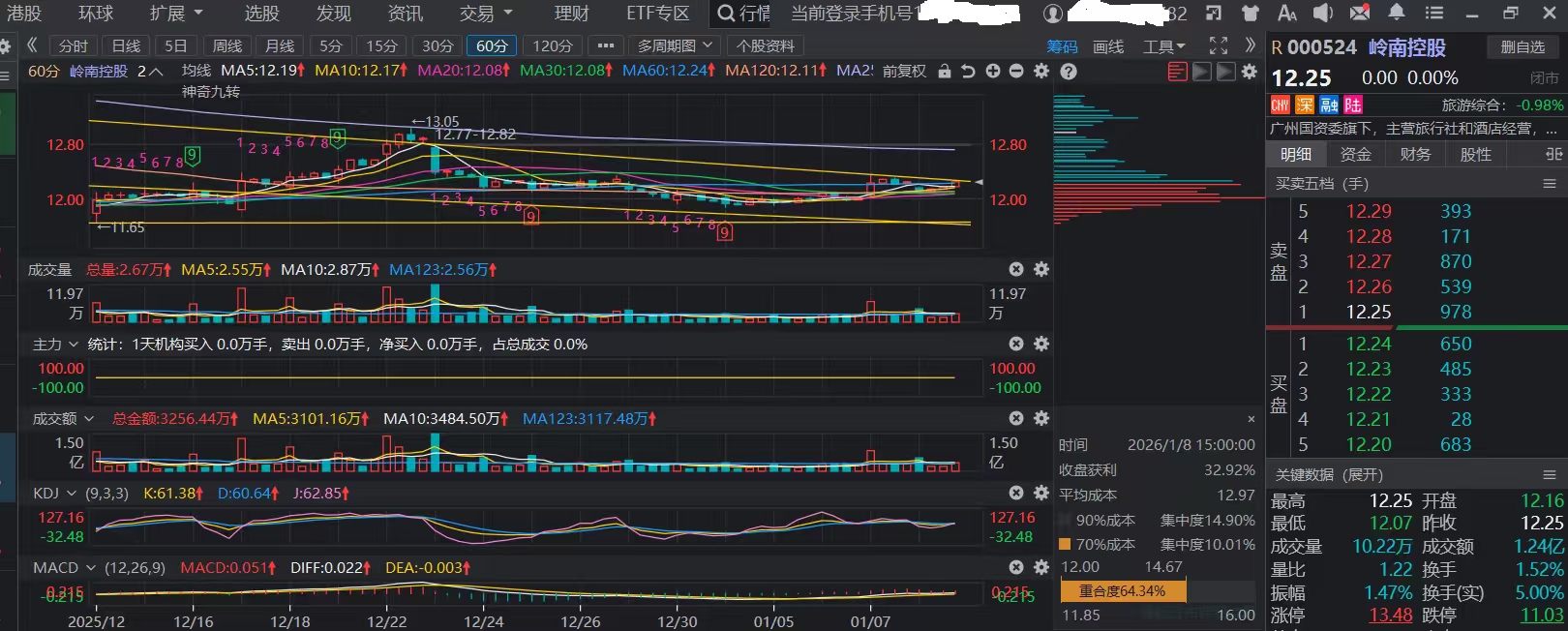 这是岭南60分钟级图形,今天走势还是被那上方黄线压制,好象前一二天发过,说明画线早就画好的,不是临时画的