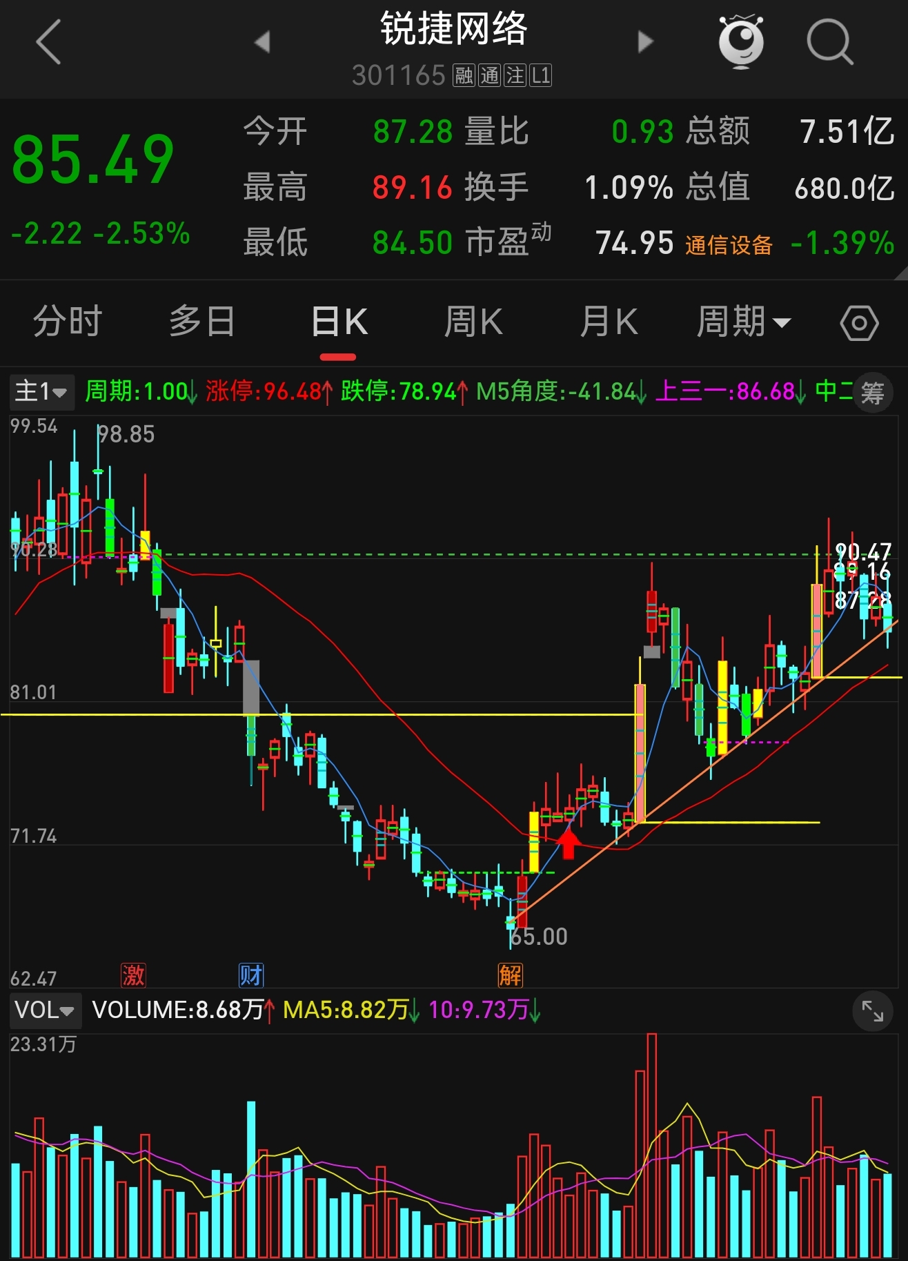 锐捷网络,目前已经到趋势线附近,明天看看走势,破了止损,不破继续持有