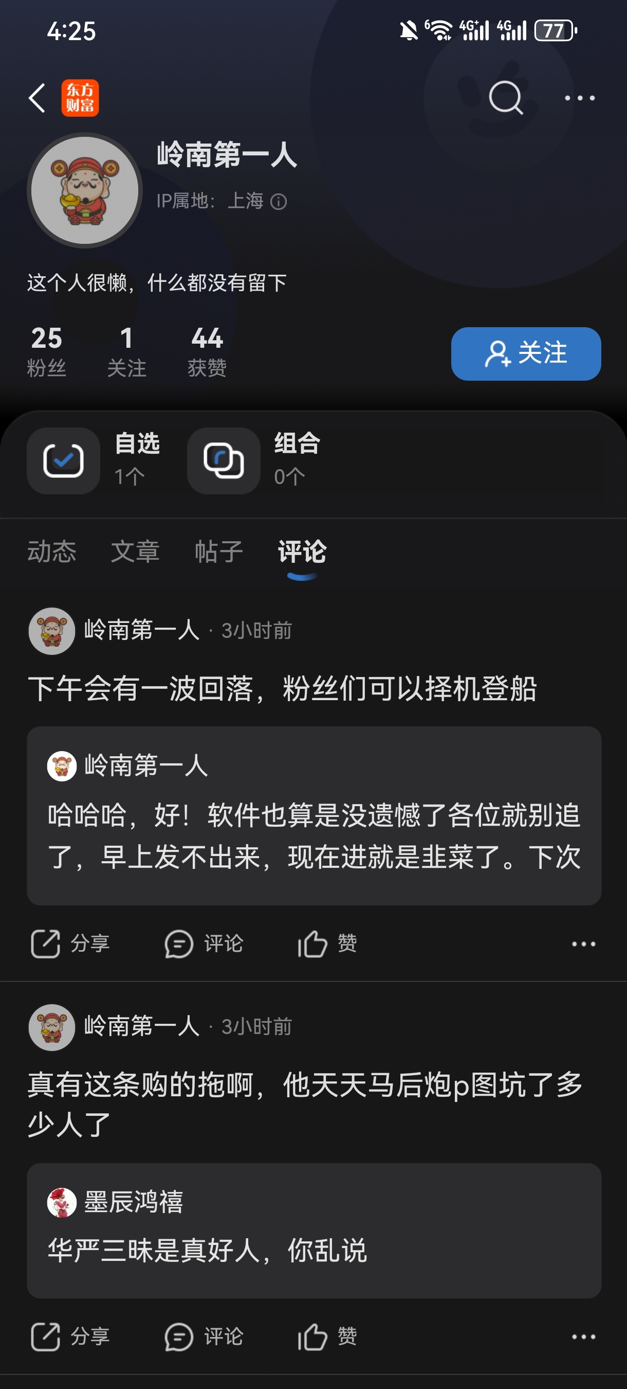 典型的白眼狼类型粉丝。天天躲在角落看文章,赚了钱就是自己牛,亏了就喷,何况你这韭