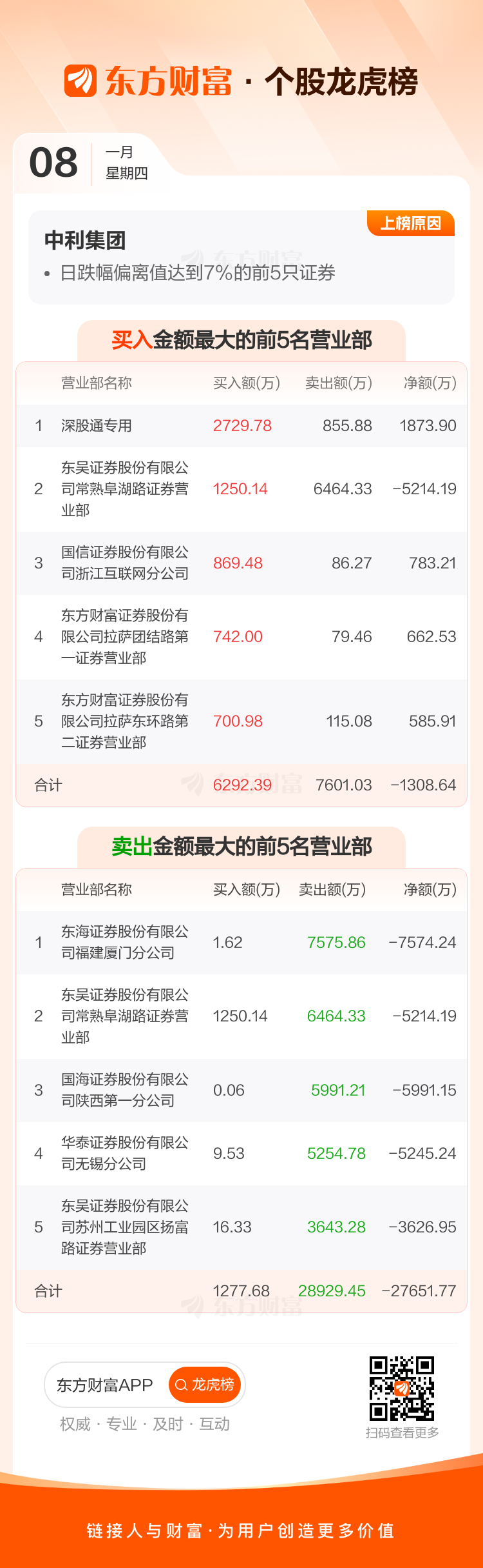交易所2026年1月8日公布的交易公开信息显示,中利集团因成为日跌幅偏离值达到7%的前5只证券上榜。中利集团当日收报3元,涨跌幅-9.91%,偏离值-10.17%,换手率9.55%,成交额6.71亿。