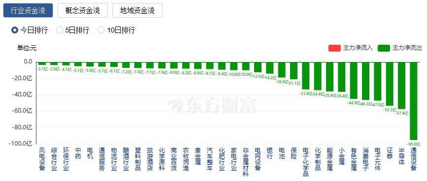净流出方面,通信设备、半导体、证券等净流出排名靠前,其中通信设备净流出95.05亿元。