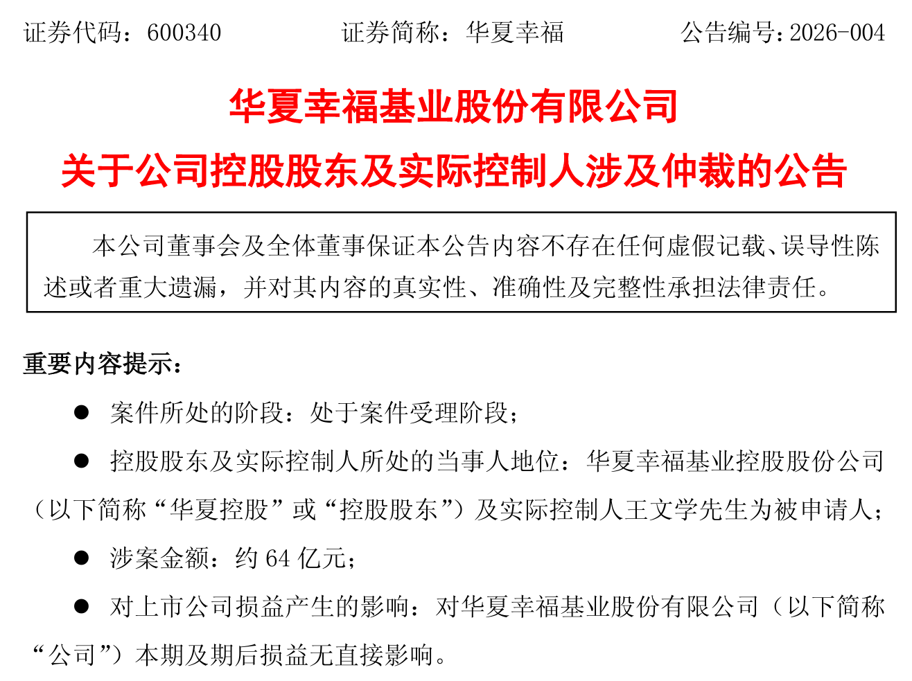 【华夏幸福:控股股东及实际控制人涉及64亿元仲裁案】华夏幸福公告,公司控股股东华