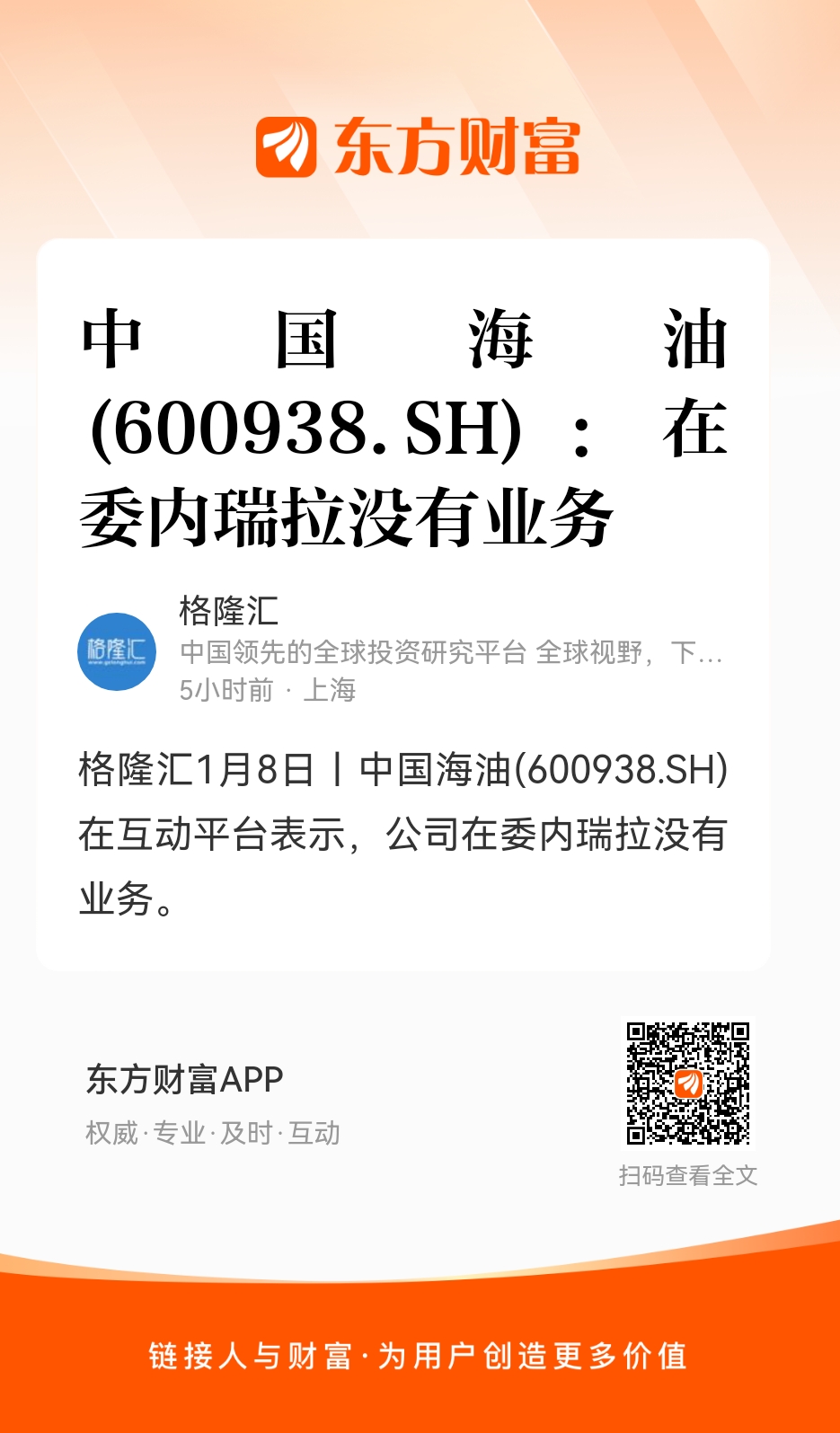 格隆汇1月8日丨中国海油(600938.SH)在互动平台表示,公司在委内瑞拉没有业务。