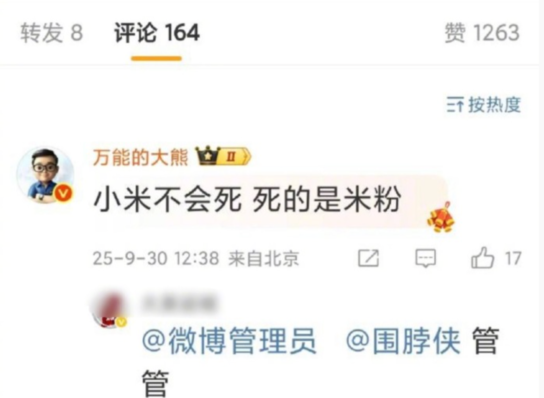 2025年9月份,他曾发文表示,小米不会死,死的是米粉。被米粉疯狂围攻。此前,该博主还因编造企业对立谣言,被法院判决道歉并赔偿16万元。