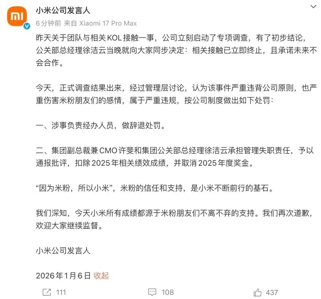 1月6日晚,小米不得不紧急发布声明,与这场公关闹剧进行切割。小米发布公告,宣布相关接触已立即终止,并承诺未来不会合作。并对此次事件中的责任人进行了处罚。设施经办人直接辞退,集团副总裁兼CMO(首席市场官)和集团公关部总经理徐洁云予以通报批评,扣除2025年年度绩效,取消2025年年终奖。