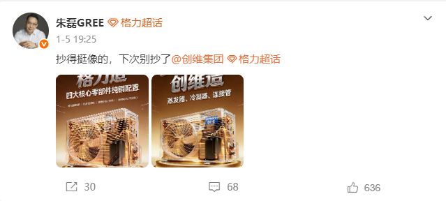 1月5日晚,朱磊在个人微博贴出两张相似度极高的图片,并配文称:“抄得挺像的,下次别抄了@创维集团。”这两张图,一张是格力电器的官方海报,另一张是来自创维空调官方微信视频号的视频截图,截图画面也是一张创维空调的宣传海报。
