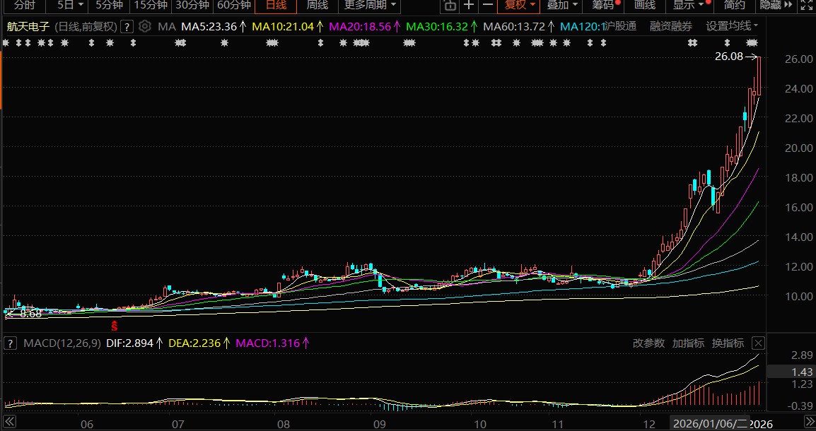 公司航天电子信息业务领域的惯性与导航、测控通信与网络信息、微电子、机电组件与传感系统、精导对抗与有效载荷等是公司传统优势专业,始终在相关行业领域内保持国内领先水平,并保持着较高的配套比例,市场份额基本呈现稳中有升态势。昨天商业航天以及相关航天概念领域爆发领涨明显,个股周三在24元位置有触顶迹象后,昨天继续10cm高位封涨,所以盘中高位,注意放量连板情况,以及注意真正顶点的出现。