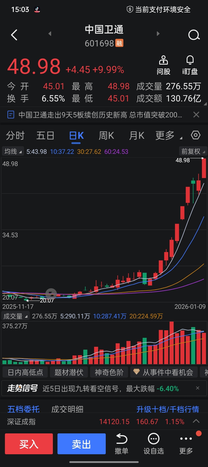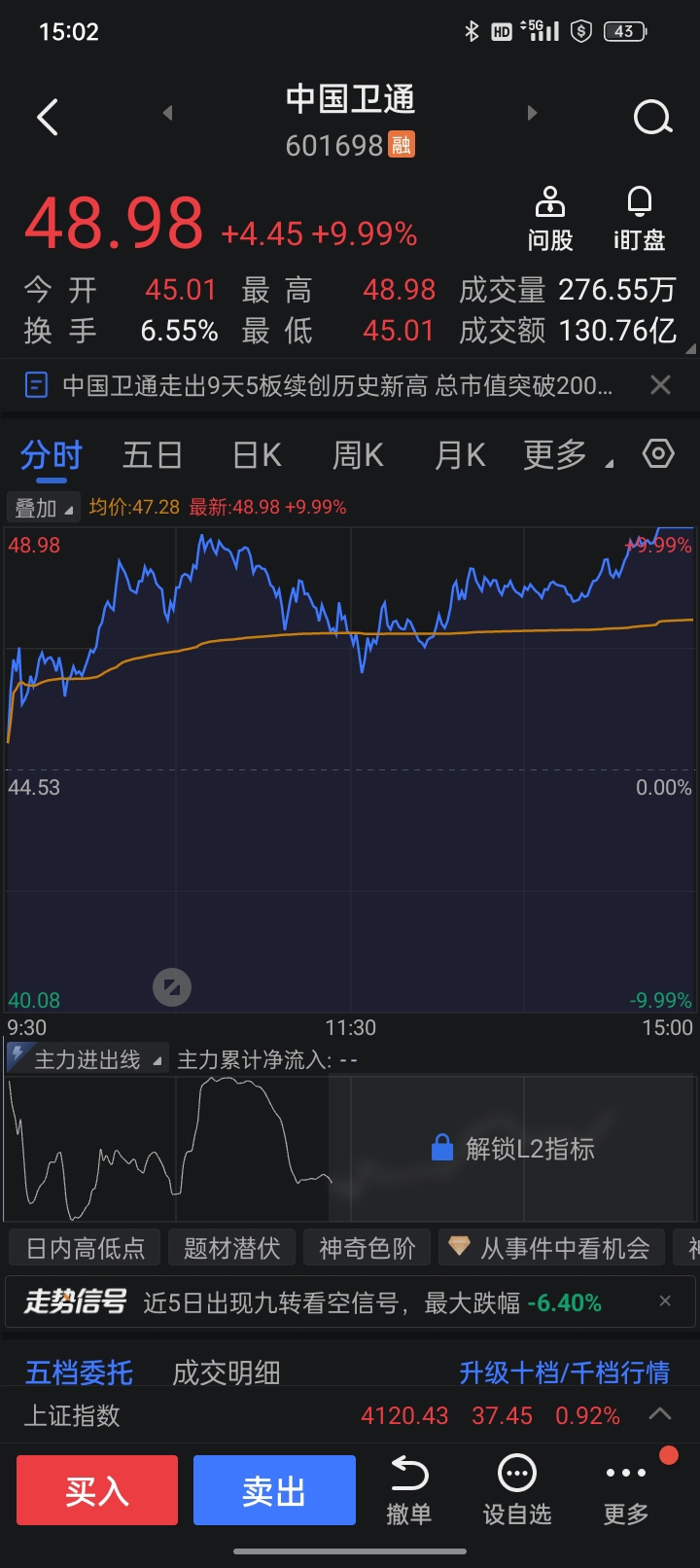 $中国卫通sh601698$放飞的大牛,今天再度涨停,继续格局的铁子666