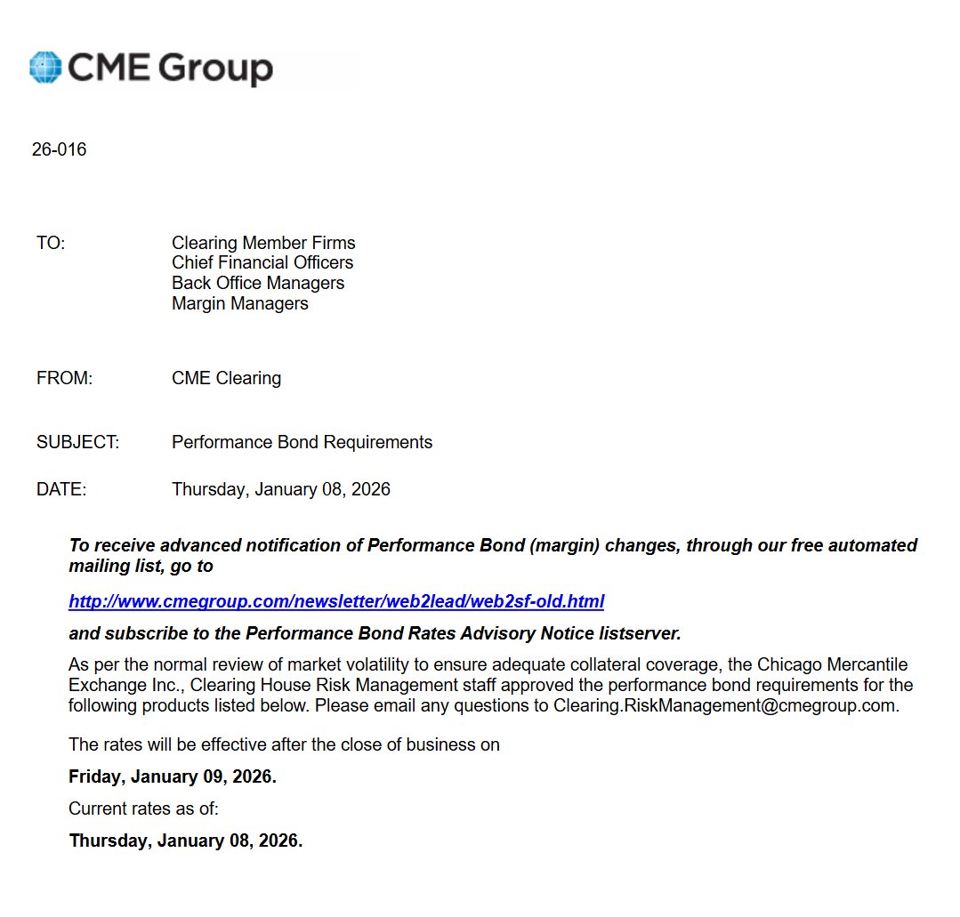 通知称,将于当地时间1月9日盘后上调黄金、白银、铂金和钯金期货的跨期价差及相关价差合约履约保证金。此外,将下调大部分天然气合约的保证金。