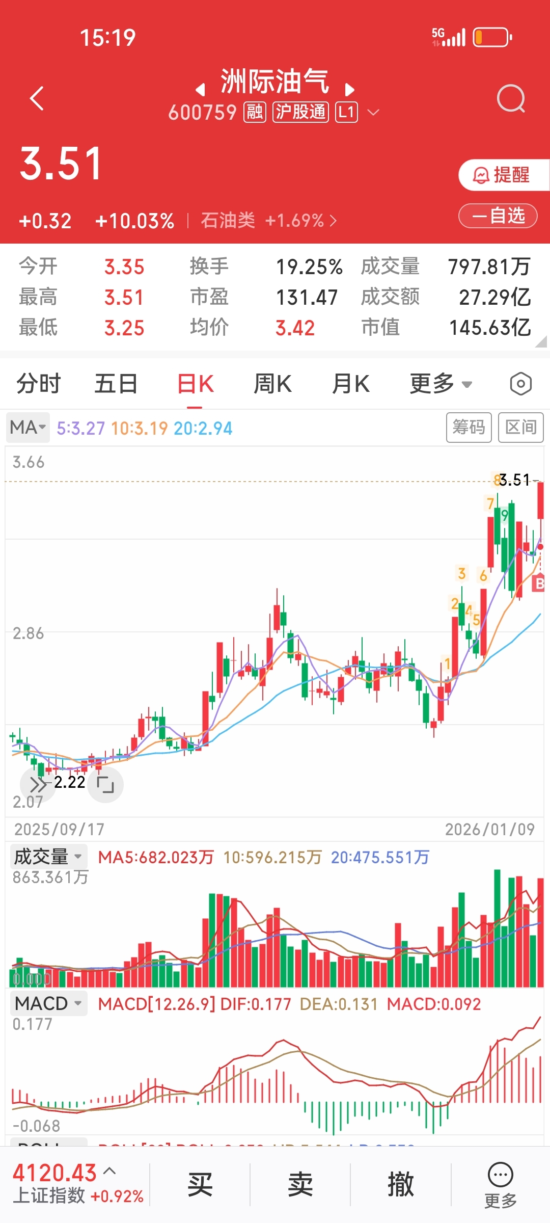 天大盘再次上涨。上午的时候出现了冲高回落,下午又拉了起来,两市再次突破了3万多亿,今天两市成交是31523亿,两市上涨3920家,下跌1349家,涨停109家,跌停一家,赚钱效应明显。