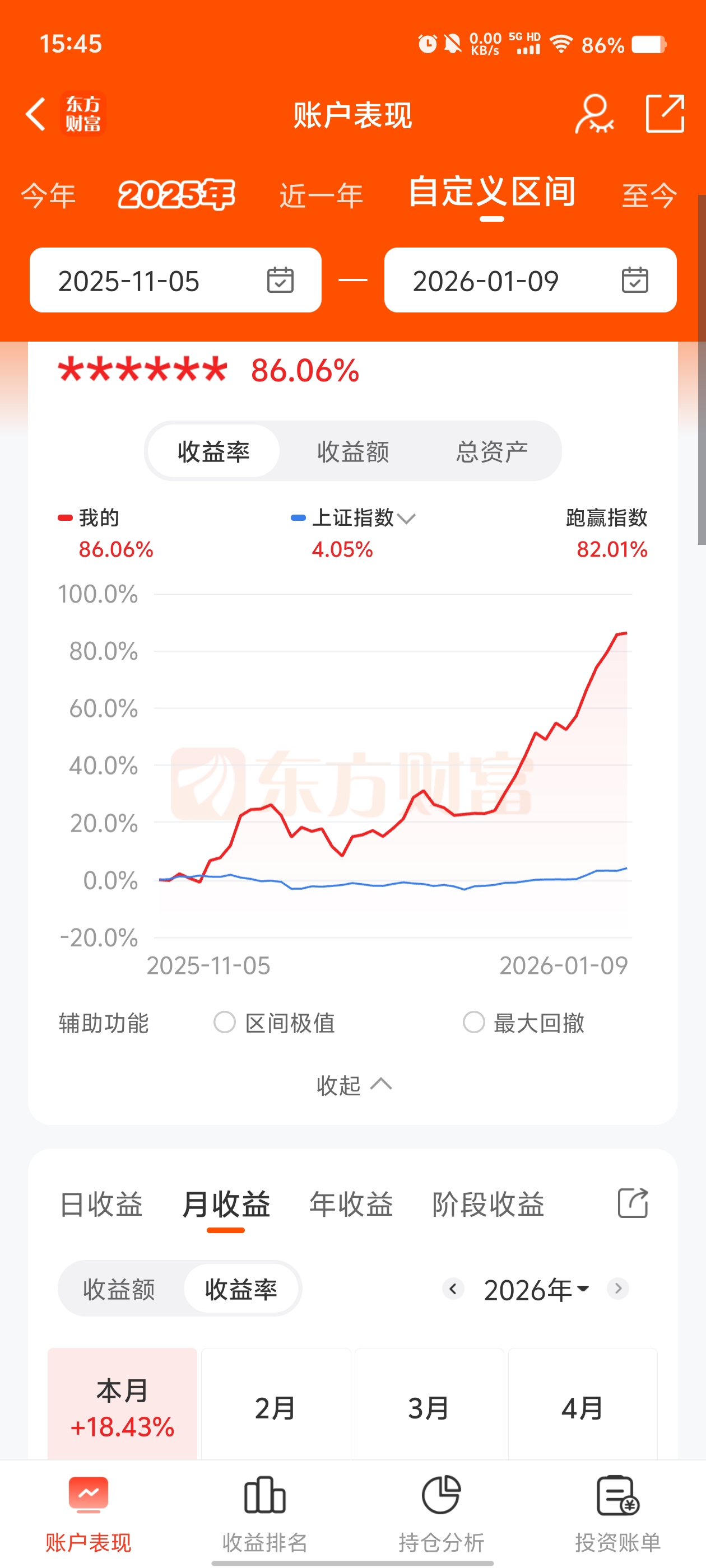 去年十月份进入股市的小散,不能融资,新年第一周获得18个点很知足了。生活在最好的年代,感恩时代的馈赠,祝愿祖国繁荣昌盛,股市常红[合十]