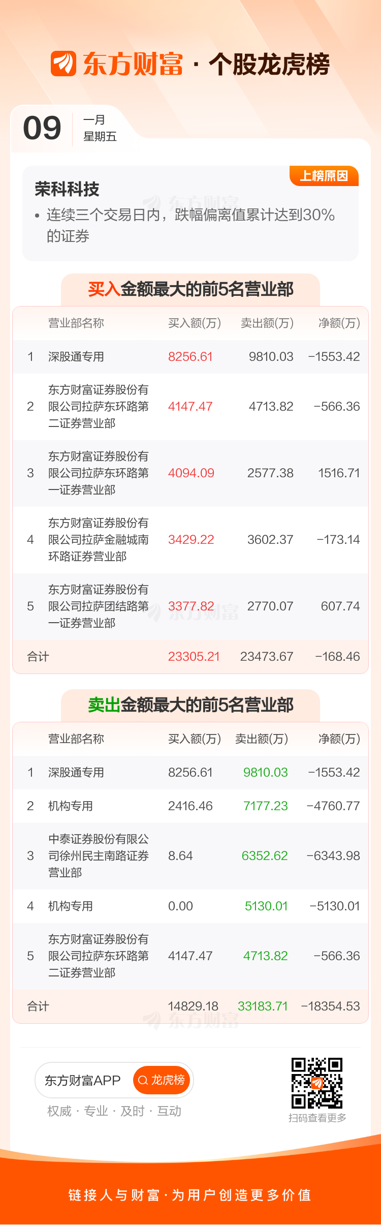 交易所2026年1月9日公布的交易公开信息显示,荣科科技因成为连续三个交易日内,跌幅偏离值累计达到30%的证券上榜。荣科科技当日收报20.21元,涨跌幅-7.67%,换手率13.68%,成交额17.75亿。异常期间1月7日至1月9日,期间涨幅-29.70%,累计偏离值-31.67%,区间成交额54.99亿。