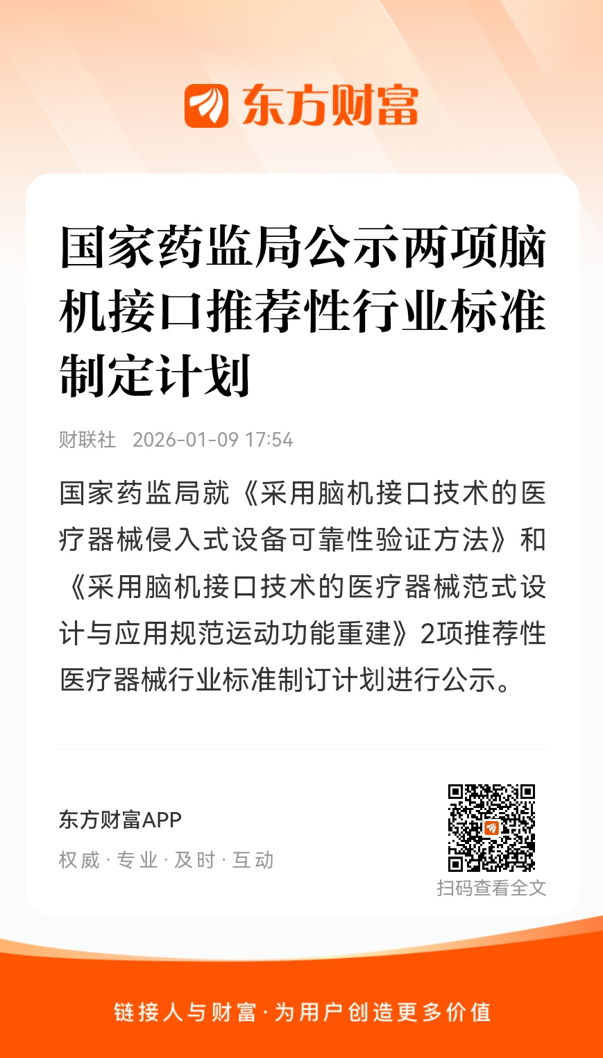 国家药监局就《采用脑机接口技术的医疗器械侵入式设备可靠性验证方法》和《采用脑机接口技术的医疗器械范式设计与应用规范运动功能重建》2项推荐性医疗器械行业标准制订计划进行公示。