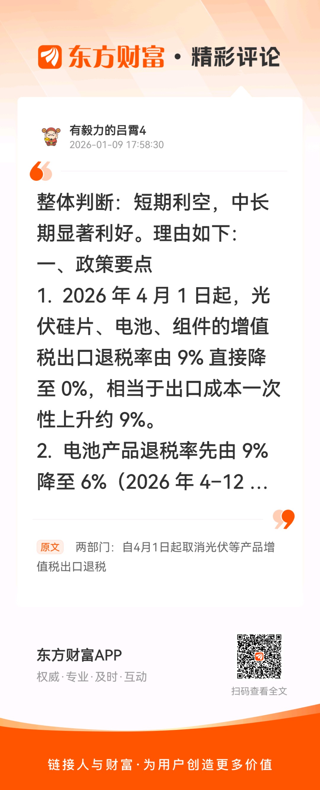//@有毅力的吕霄4 :整体判断:短期利空,中长期显著利好。理由如下:一、政策要点1. 2026 年 4 月 1 日起,光伏硅片、电池、组件的增值税出口退税率由 9% 直接降至 0%,相当于出口成本一次性上升约 9%。2. 电池产品退税率先由 9% 降至 6%(2026 年 4–12 月),2027 年 1 月 1 日起也归零。二、短期冲击——利空3. 利润再压缩:行业本就处于“增量不增价”的亏损状态,9% 的成本增幅大概率无法全部向下游传导,Q2 起出口业务将出现亏损面扩大。4. 订单抢跑后的回落:2025 年底已出现过“抢出口”透支需求,2026 年 4 月后出口量预计环比下滑,短期报表难看。5. 现金流压力:退税款占出口收入 9%,取消后营运资金一次性减少,高杠杆的二三线企业风险陡增。三、中长期效果——利好6. 加速落后产能出清:靠“退税补贴—低价抢市”模式生存的小厂将率先退出,行业集中度提升。7. 价格底部抬升:成本刚性增加 0.02–0.03 元/W,海外客户可接受度较高,有望结束近两年“越卖越亏”的恶性竞价,修复龙头盈利。8. 减少贸易摩擦:欧美一直指责中国“补贴倾销”,主动归零退税可在谈判中换取关税豁免或降低“双反”概率,为头部企业海外产能布局赢得空间。9. 倒逼技术升级:利润不再靠补贴,企业唯有通过高效电池、高功率组件等差异化产品获取溢价,利于 N 型、钙钛矿等新技术加速产业化。四、结论对板块指数和二三线公司股价,2026 年二季度会有一次“利空兑现”式调整;但政策意图是“以退为进”,用 9–12 个月完成产能出清后,龙头出货量与单位盈利有望同步回升,中长期对隆基、晶科、晶澳、天合等全球化布局充分的头部企业构成实质性利好。