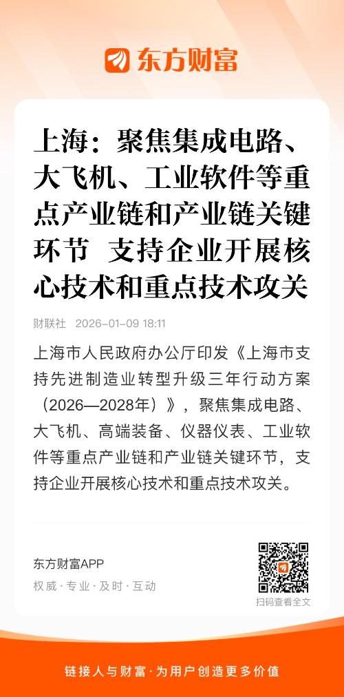 上海市人民政府办公厅印发《上海市支持先进制造业转型升级三年行动方案(2026—2028年)》,加速关键核心技术攻关。支持企业聚焦激光制造、量子、光子、新型功能材料、新型能源等前沿技术开展基础研究。聚焦集成电路、大飞机、高端装备、仪器仪表、工业软件等重点产业链和产业链关键环节,支持企业开展核心技术和重点技术攻关。