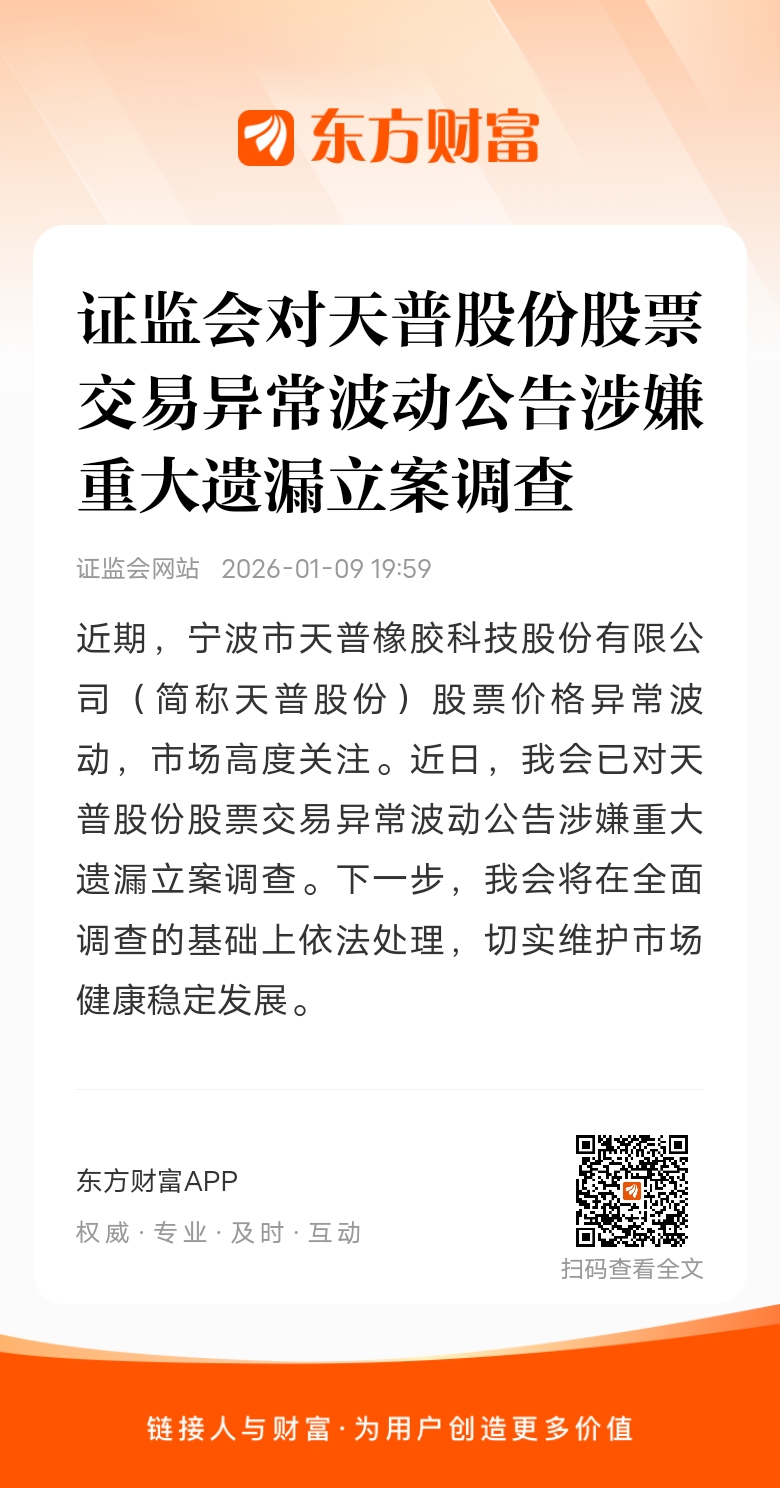 证监会1月9日消息,近期,天普股份(605255)股票价格异常波动,市场高度关注。近日,证监会已对天普股份股价异动公告涉嫌重大遗漏立案调查。
