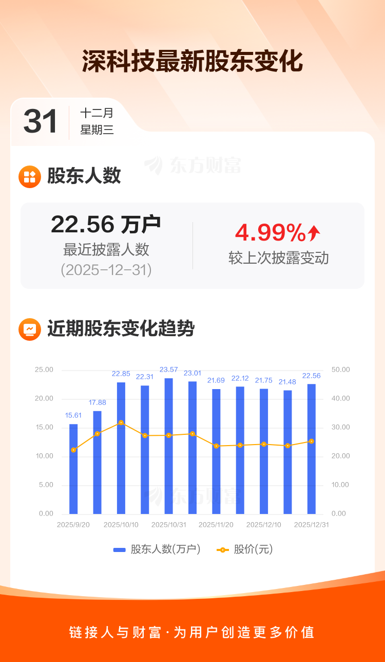 深科技最新披露数据显示,截至12月31日公司股东户数为22.56万户,较上期(2025年12月19日)增加1.07万户,增幅为4.99%。户均持有流通股数量由上期的7314股下降至6966股,户均持股金额由上期的17.34万元增加至17.61万元。