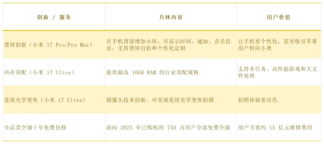 它的价值主线是:高端化——不是纯粹卖高价,而是卖高端体验:比如小米17 Pro的背屏创新,空调推出十年免费保修计划。