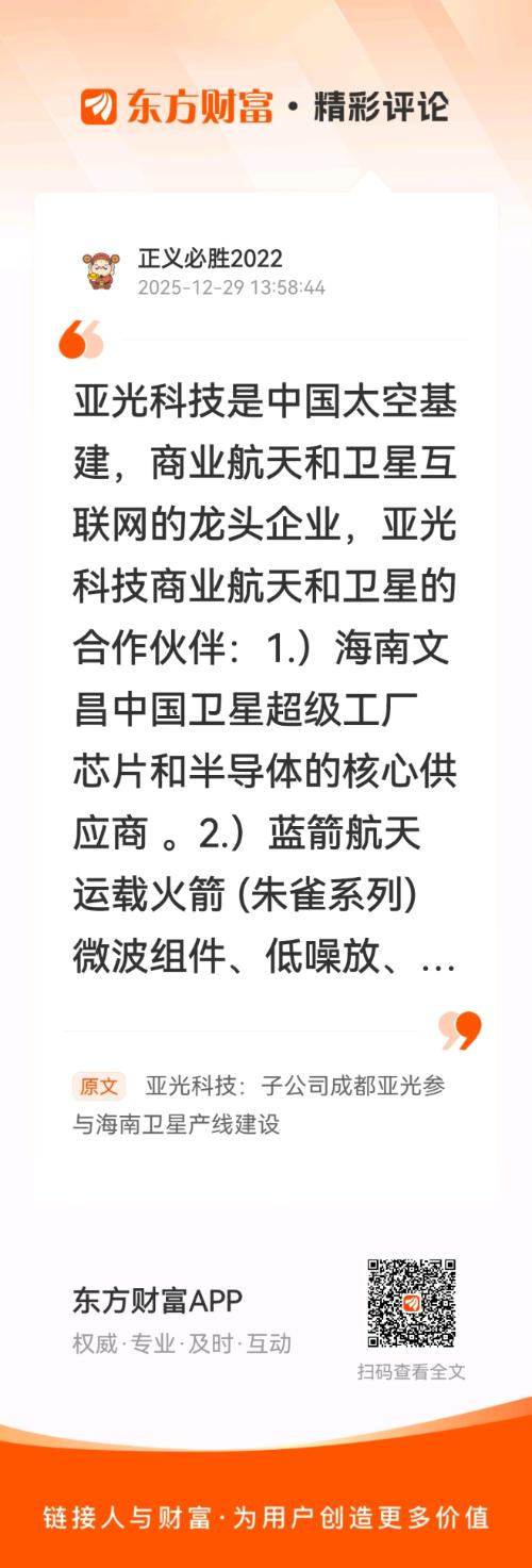 //@正义必胜2022 :亚光科技是中国太空基建,商业航天和卫星互联网的龙头企业,亚光科技商业航天和卫星的合作伙伴:1.)海南文昌中国卫星超级工厂 芯片和半导体的核心供应商 。2.)蓝箭航天 运载火箭 (朱雀系列) 微波组件、低噪放、混频器、控制系统配套。3. )GW 星座/千帆星座 卫星互联网 TR 组件、星载电子模块、测控设备。4.)快舟火箭 运载火箭/卫星 半导体器件、VDES 卫星通信组件。5.)航天科技/科工集团 综合航天工程 火箭控制系统、地面站配套产品。6)航天科技集团5院,是公司十大客户之一。。。