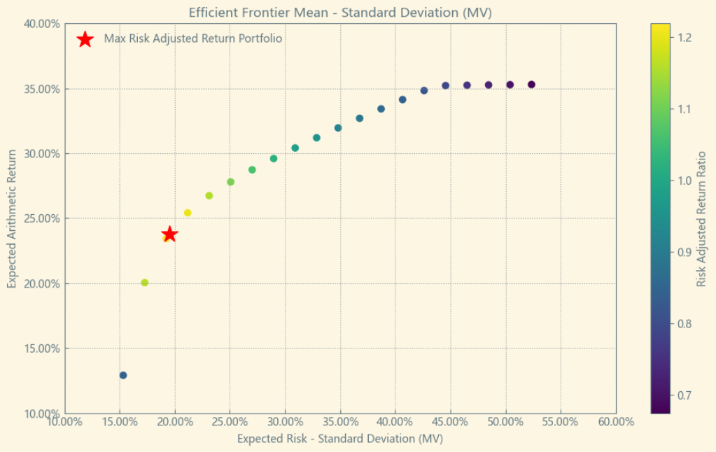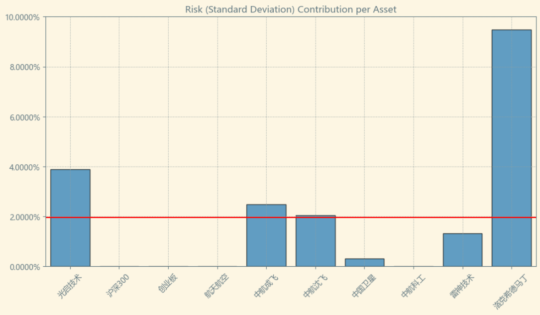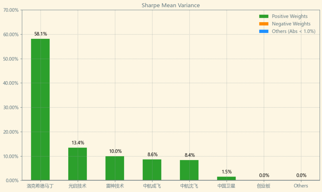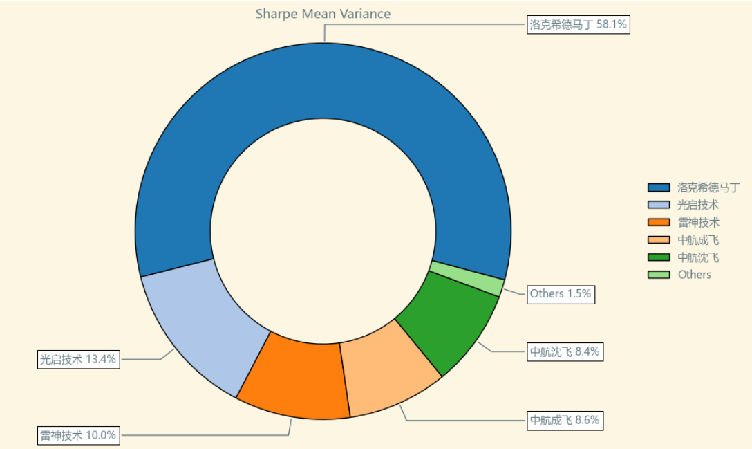 按最高夏普比率配置的话,系统给的权重为13.4%,最高权重给了洛克希德马丁占比58.1%。