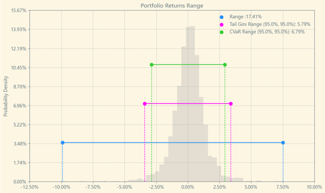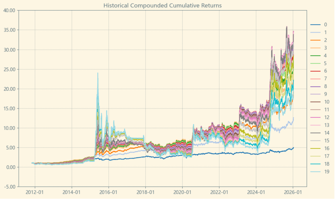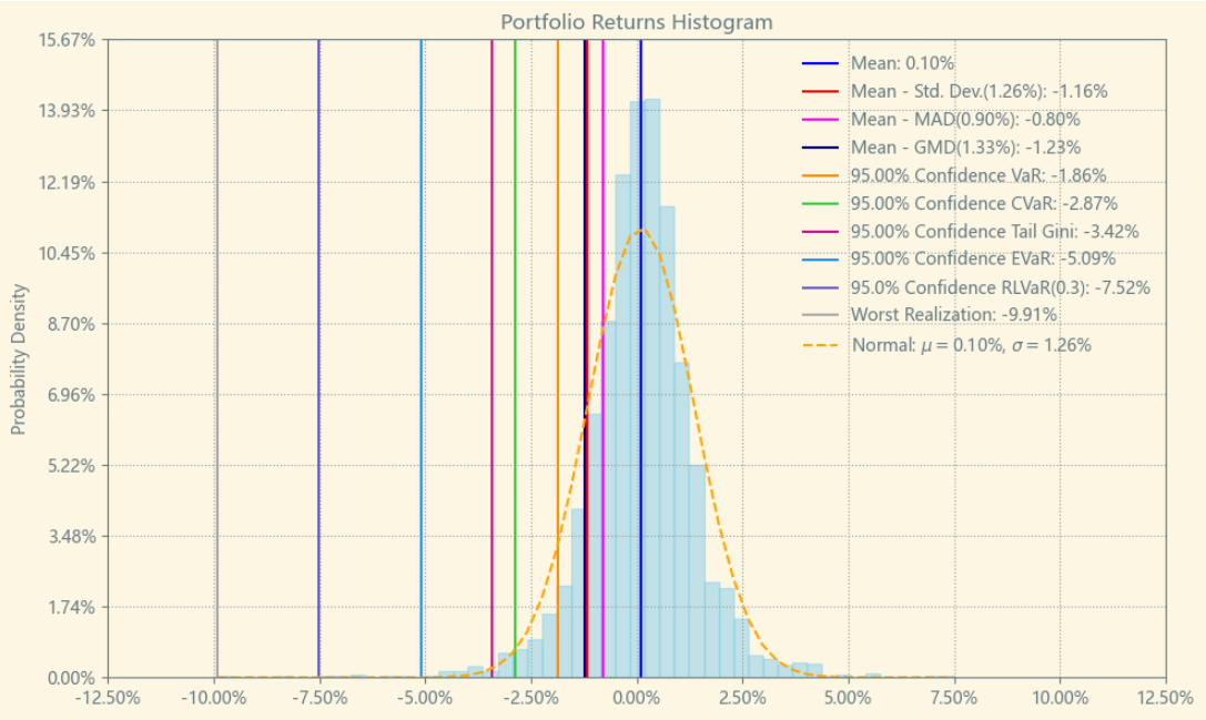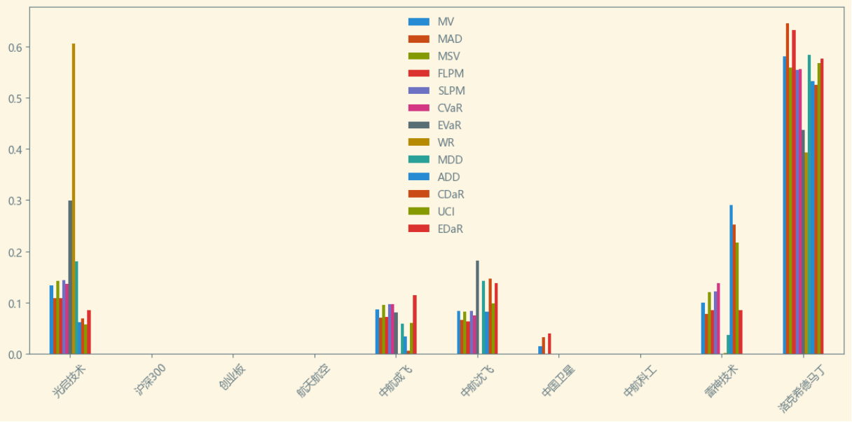 最后看下整个投资组合的情况,日度均值回报在0.10%,比上次测的化纤行业高40%,而且6.79%的CVaR波动反而还更小。(Mean;CVaR)