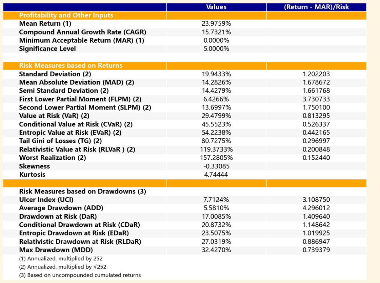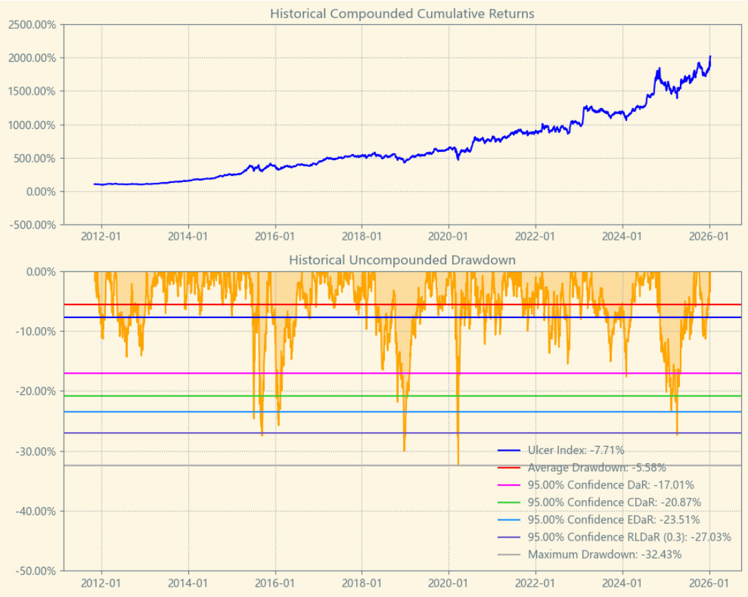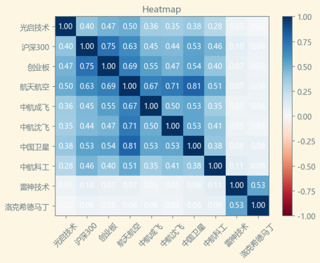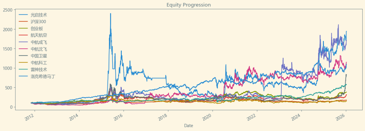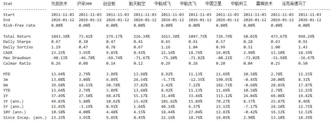 区间累计回报近25倍,最大回撤32.43%,投资组合的整体表现要好于光启技术个股。整个航天航空行业盈利能力优异,波动也低,夏普比率1.21堪称卓越。(Cumulative Returns;Maximum Drawdown)