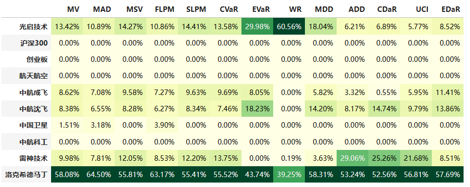 如果换成其他约束,系统给的配置比例也大同小异,基本是在公司和洛克希德马丁之间做取舍了。