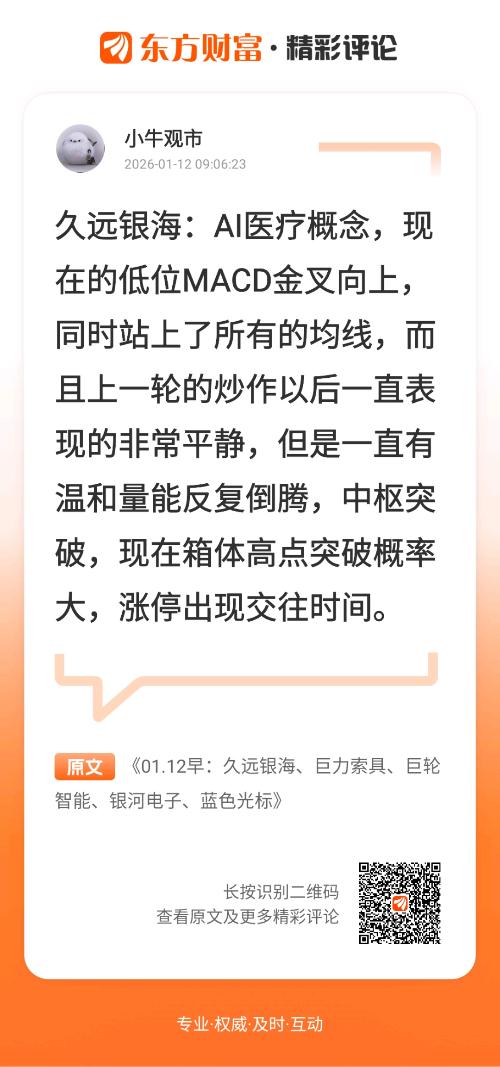//@小牛观市 :久远银海:AI医疗概念,现在的低位MACD金叉向上,同时站上了所有的均线,而且上一轮的炒作以后一直表现的非常平静,但是一直有温和量能反复倒腾,中枢突破,现在箱体高点突破概率大,涨停出现交往时间。 感谢小牛的分享