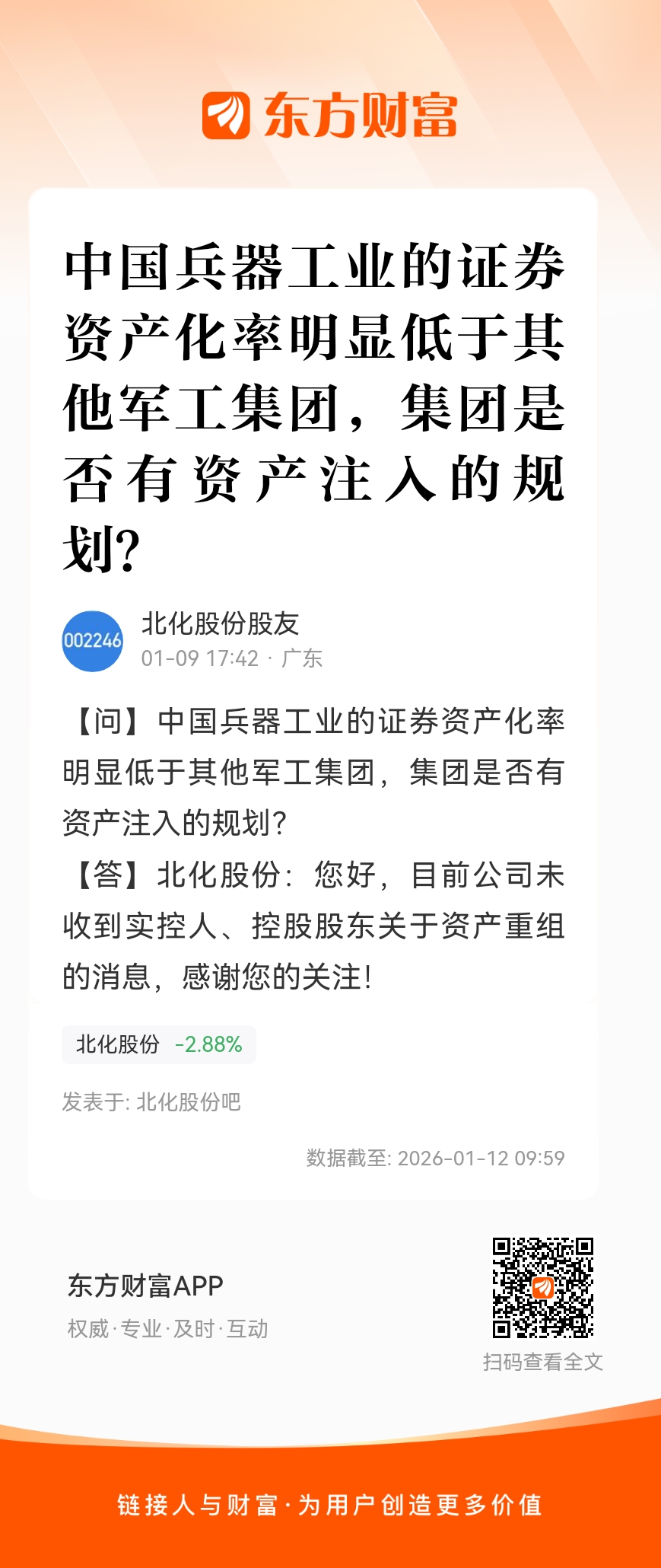 中国兵器工业的证券资产化率明显低于其他军工集团,集团是否有资产注入的规划?