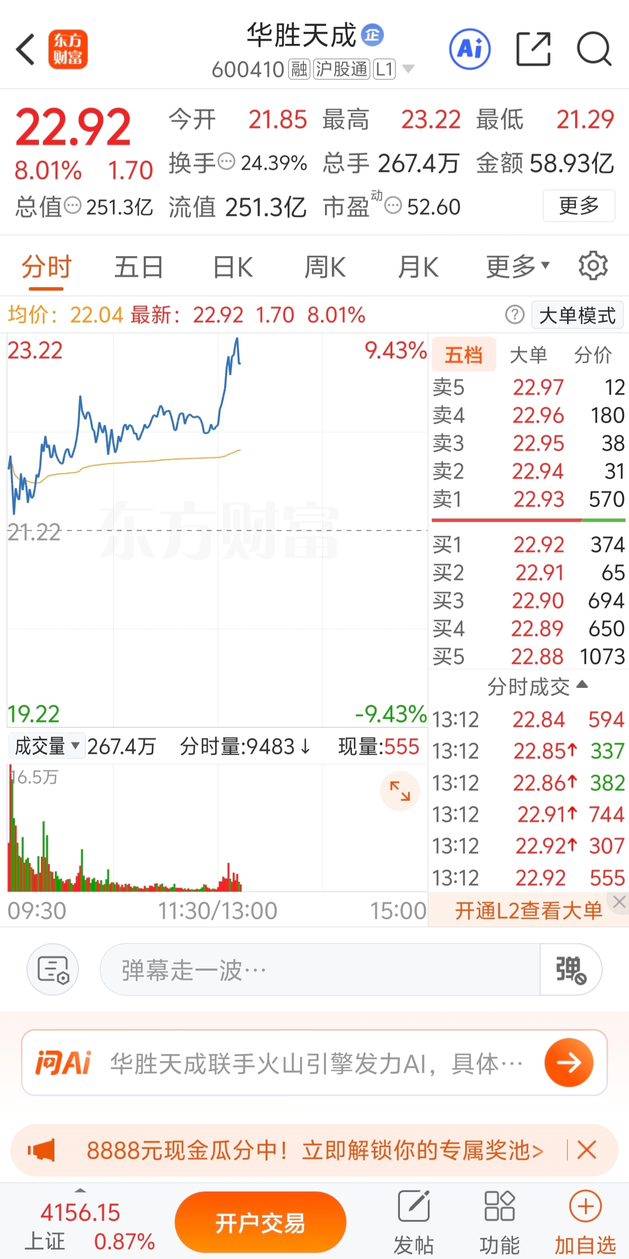 早上推荐的 华胜天成,有没有跟上的朋友!目前上涨八个点了