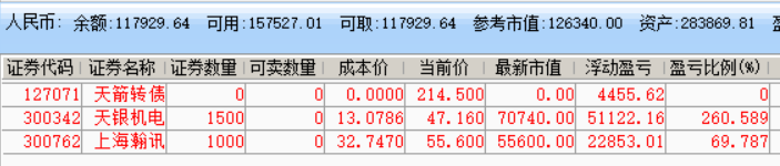 商业航天进入加速阶段,不晓得高潮在什么时候来,还是稳妥些的好。于是开盘加仓天银机电做T的资金还是在涨停板上把昨日可卖的筹码卖出了。然后把天银机电出来的资金买了天剑转债做了4个多点的日内回转,在收盘集合竞价出来。在上海瀚讯开盘价出来后将剩余可用资金稍微低挂单买入,然后在收盘集合竞价T了出来,增加了4个多点的差价利润。收盘维持在不到5成的仓位。目前账户资产达到了28万+。