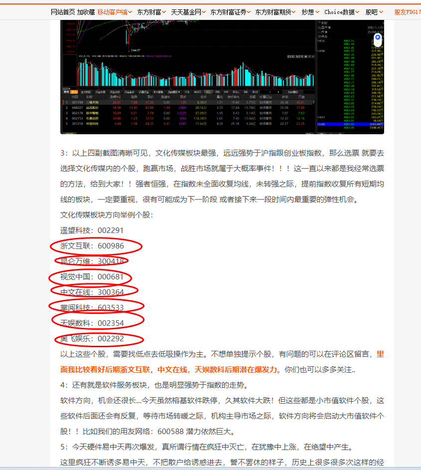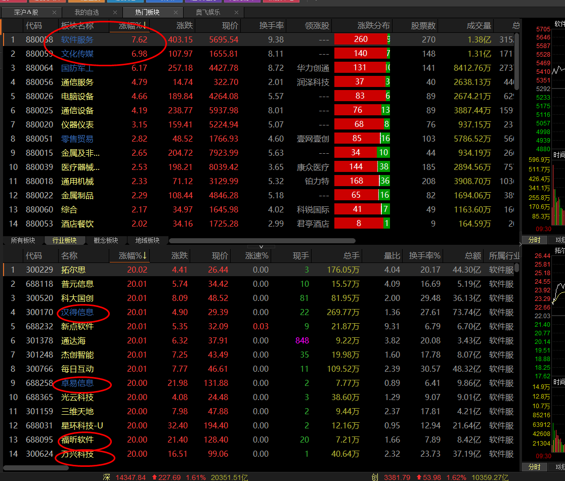 1:今天板块文化传媒,软件服务全面暴动!我之前就说过,硬件已经上天了,软件一定会有春天,今天只要是软件个股,涨幅最低5个百分点起步!!