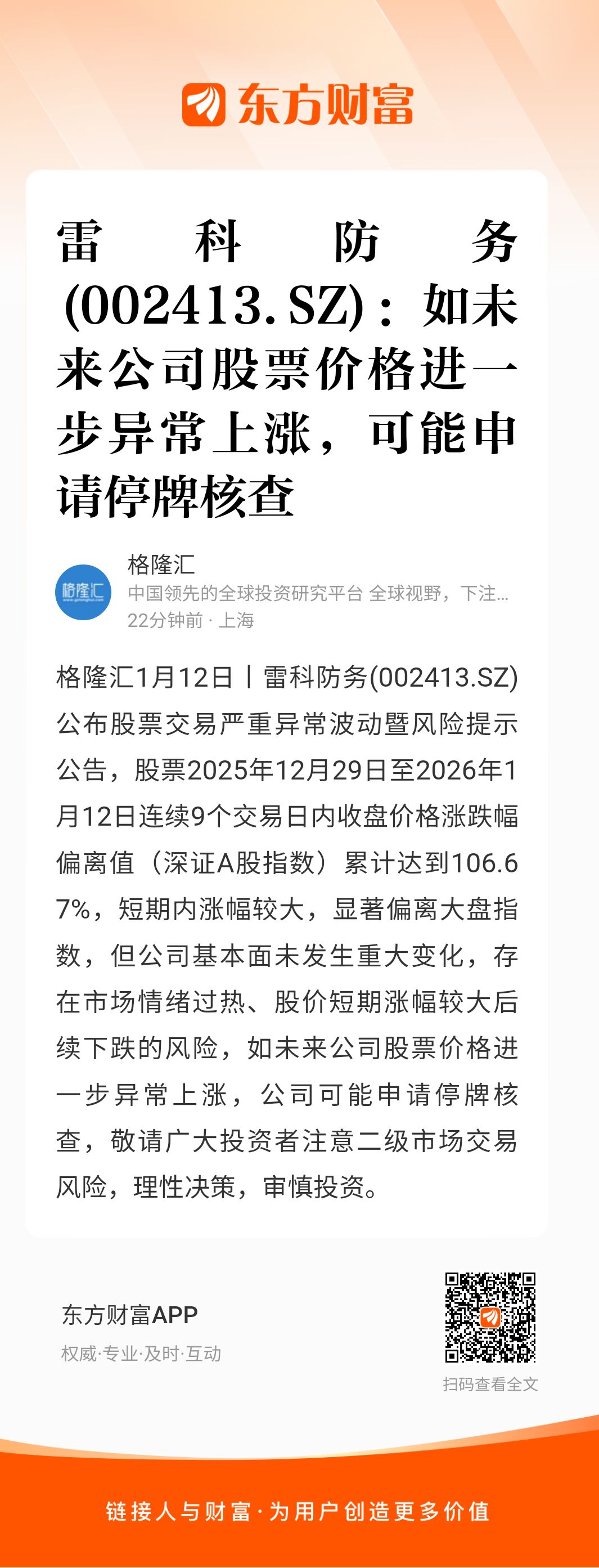 格隆汇1月12日丨雷科防务(002413.SZ)公布股票交易严重异常波动暨风险提示公告,股票2025年12月29日至2026年1月12日连续9个交易日内收盘价格涨跌幅偏离值(深证A股指数)累计达到106.67%,短期内涨幅较大,显著偏离大盘指数,但公司基本面未发生重大变化,存在市场情绪过热、股价短期涨幅较大后续下跌的风险,如未来公司股票价格进一步异常上涨,公司可能申请停牌核查,敬请广大投资者注意二级市场交易风险,理性决策,审慎投资。