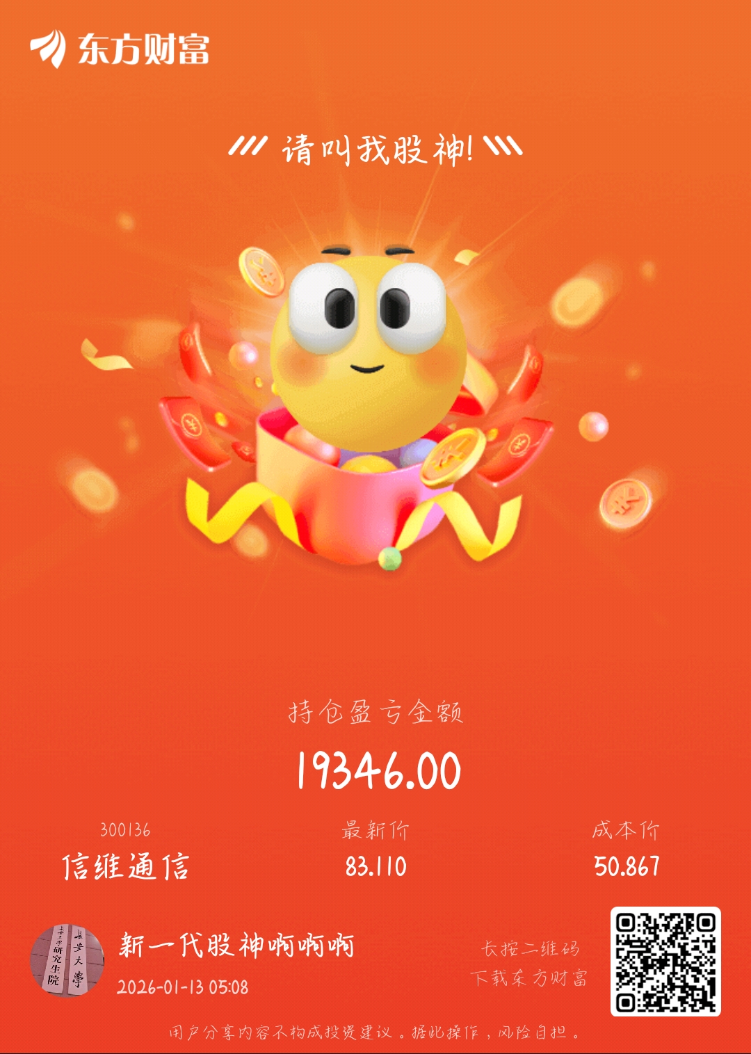 我只能说一战封神,我感觉这两天把一年的都赚够了,我只有10个多一点的资金,是该贪