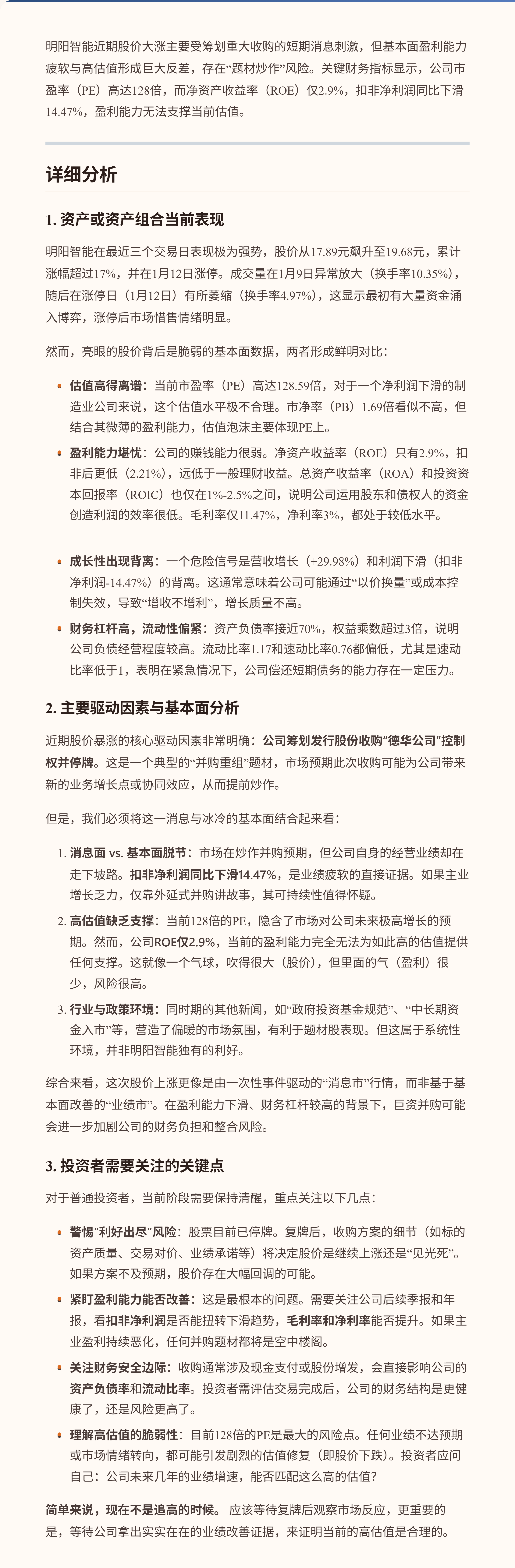 $明阳智能(SH601615)$ **当前对明阳智能持谨慎观望态度。** 核心逻辑在于,公司近期股价大涨主要受筹划重大收购的短期消息刺激,但基本面盈利能力疲软与高估值形成巨大反差,存在“题材炒作”风险。关键财务指标显示,公司市盈率(PE)高达128倍,而净资产收益率(ROE)仅2.9%,扣非净利润同比下滑14.47%,盈利能力无法支撑当前估值。