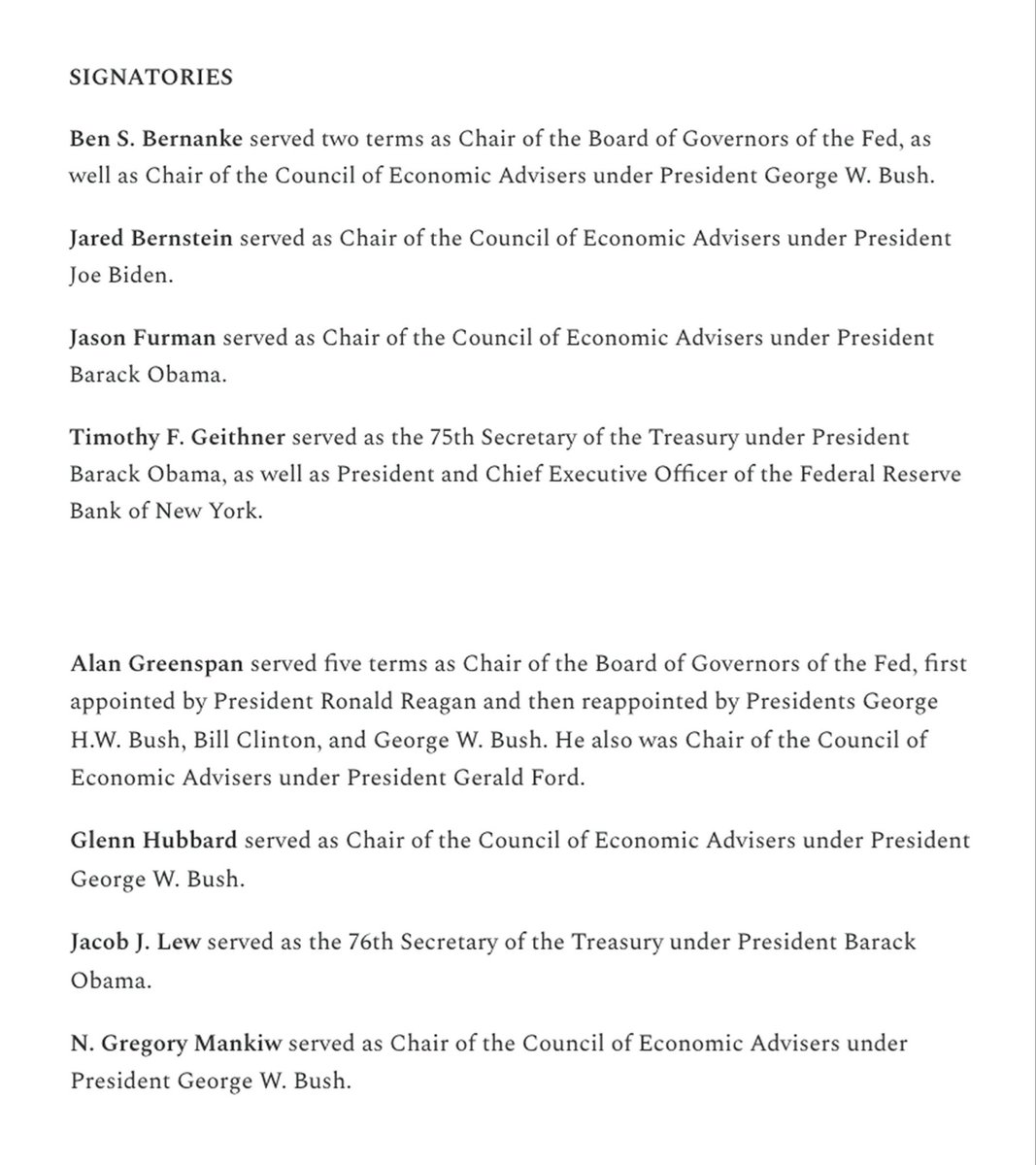 在周一发布的声明中,包括四位前财政部长在内的十位经济政策领导人,与前美联储主席耶伦、伯南克和格林斯潘一道,对鲍威尔表示支持。