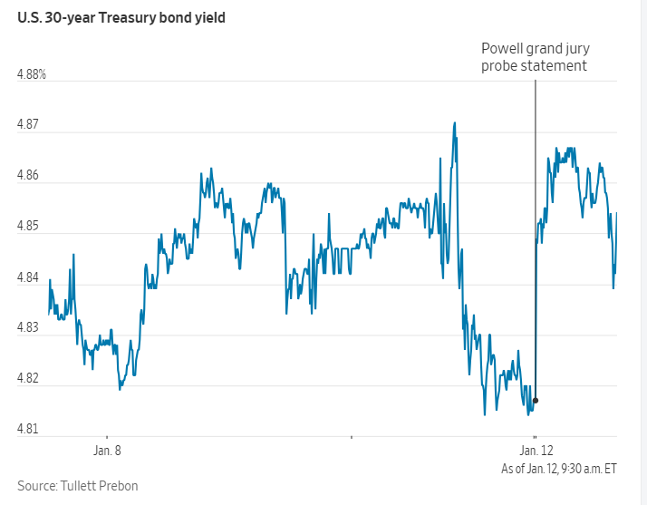 周一早盘,在美联储主席鲍威尔表示自己成为联邦调查目标后,30年期美国国债收益率上升。通常,当投资者担心美联储独立性受到威胁时,便会抛售长期国债。